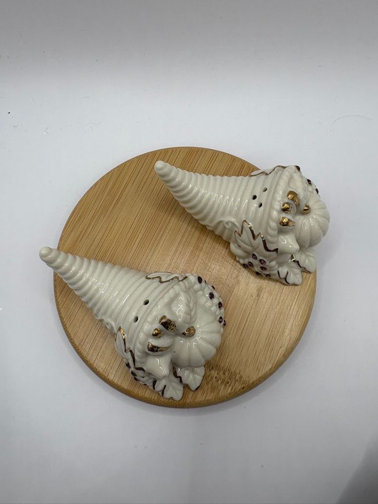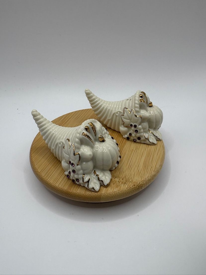 Lenox Cornucopia Salt and Pepper Adorned with purple “gems” Measures 3 inches by 1 1/2 inches No chips or cracks