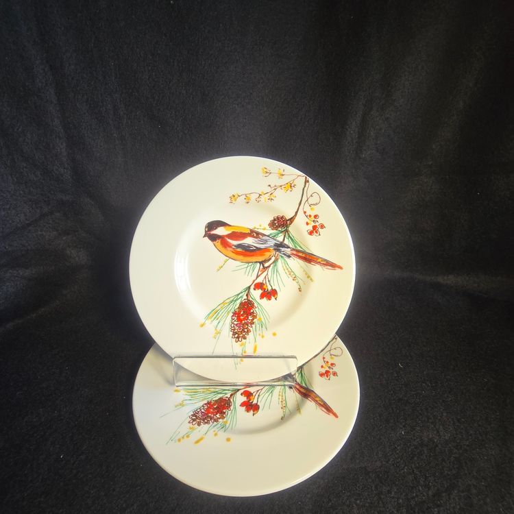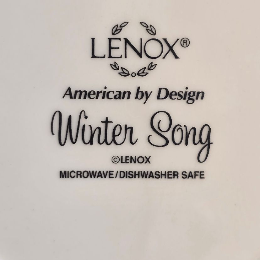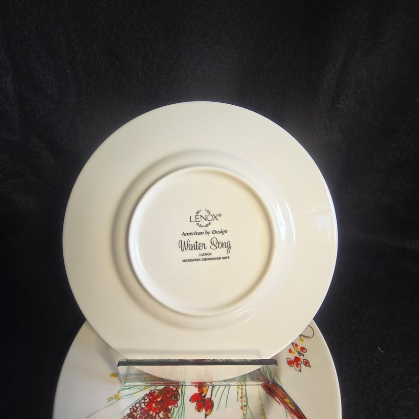 From the Lenox “Winter Song” holiday collection, these 6-inch party/dessert plates feature a charming songbird perched among pinecones and berries. The detailed artwork captures the beauty of the winter season, making it a wonderful accent for holiday dining, dessert service, or decorative display.