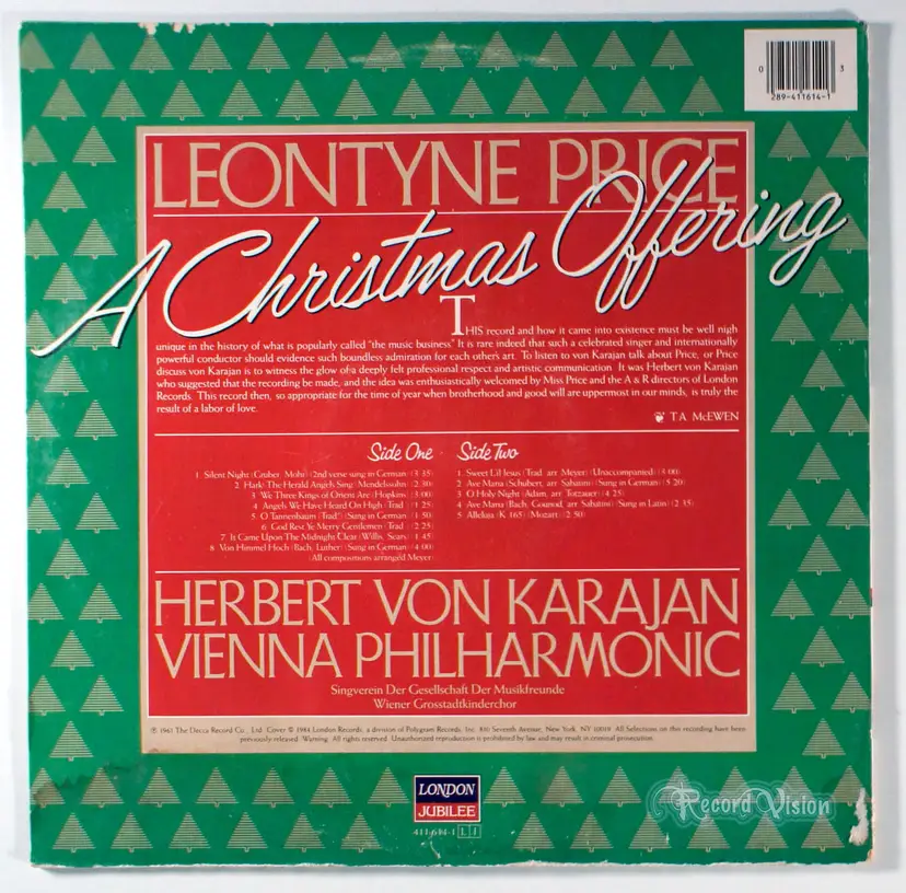 A Christmas Offering is a collection of holiday songs by Leontyne Price. The liner notes state: "This record and how it came into existence must be well nigh unique in the history of what is popularly called 'the music business.' It is rare indeed that such a celebrated singer and internationally powerful conductor should evidence such boundless admiration for each other's art. To listen to Von Karajan talk about Price, or Price discuss von Karajan is to witness the glow of a deeply felt professional respect and artistic communication. It was Heerbert von Karajan who suggested that the recording be made and the idea was enthusiastically welcomed by Miss Price and the A&R directors of London Records. This record then, so appropriate for the time of year when brotherhood and goodwill are uppermost in our minds, is truly the result of a labor of love."