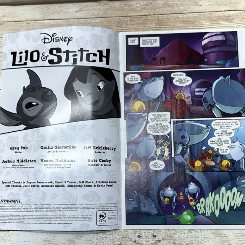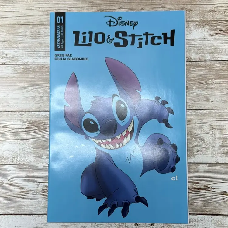 This is Lilo & Stitch #1, published by Dynamite Entertainment in 2024. This all-new issue kicks off a fresh comic series based on the beloved Disney franchise. Written by Greg Pak and illustrated by Giulia Giacomino, it features a vibrant Cover A with Stitch front and center.