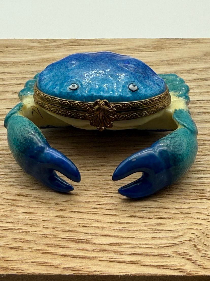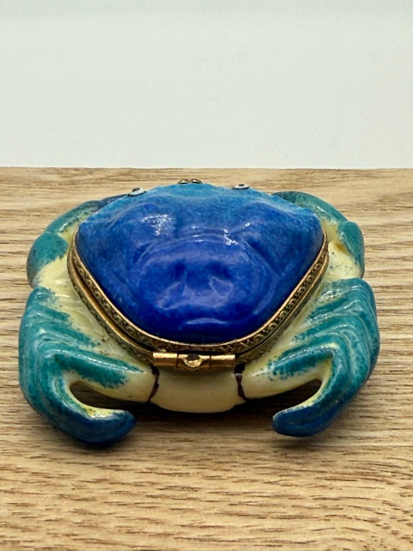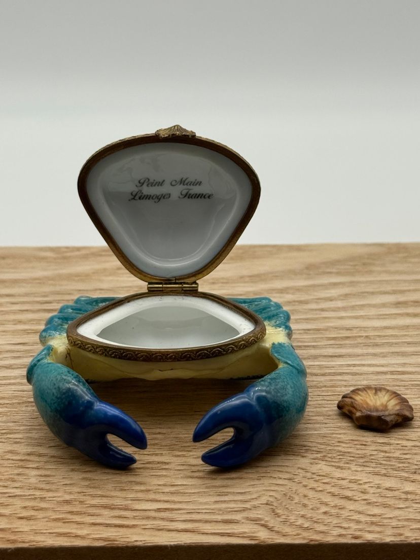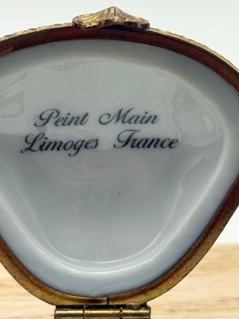 Measures 2.25” wide, 2.5” deep, 1” tall No chips or cracks Comes with brown shell Trinket inside Paint Mann Lemos, France Peint Main Limoge France marked on inside of lid