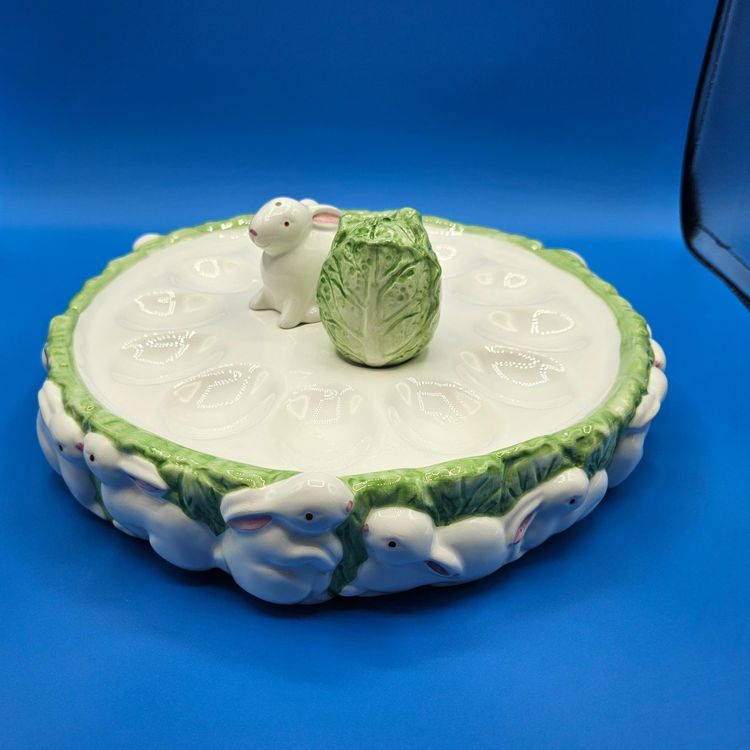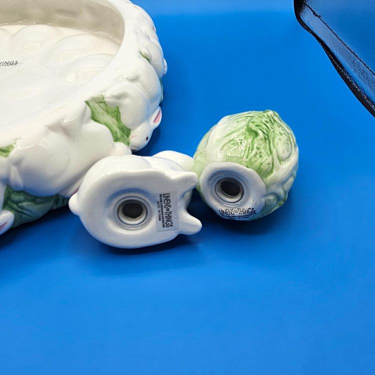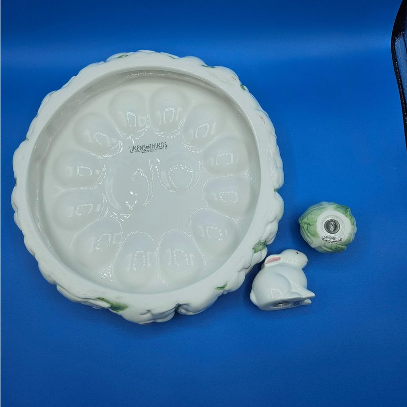 Linen N Things NIB 10.5" Egg Plate With Salt & Pepper Shakers, Easter, Bunny, Cabbage, Ceramic