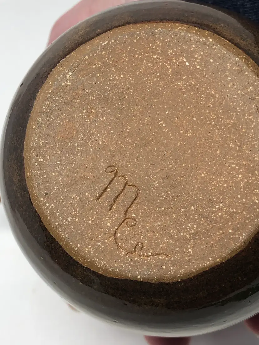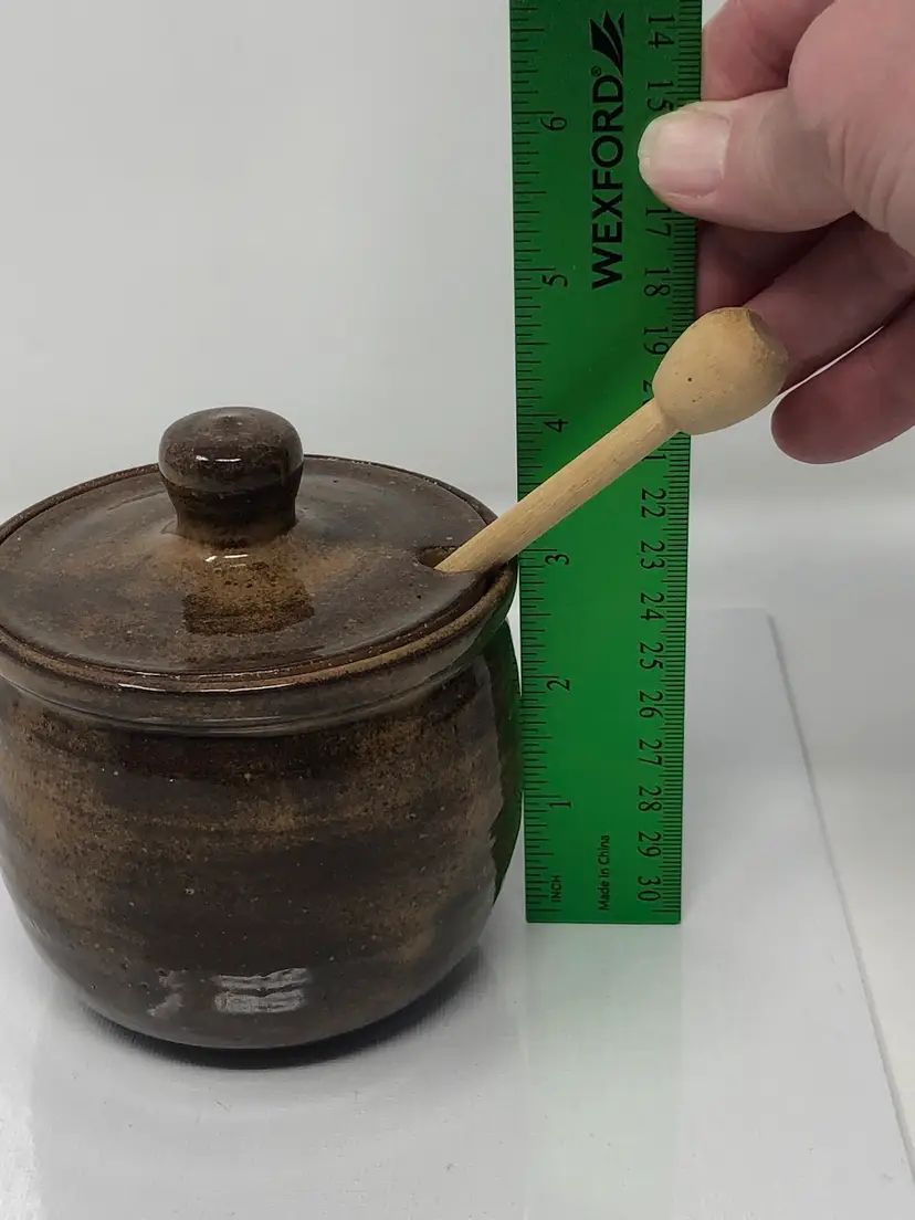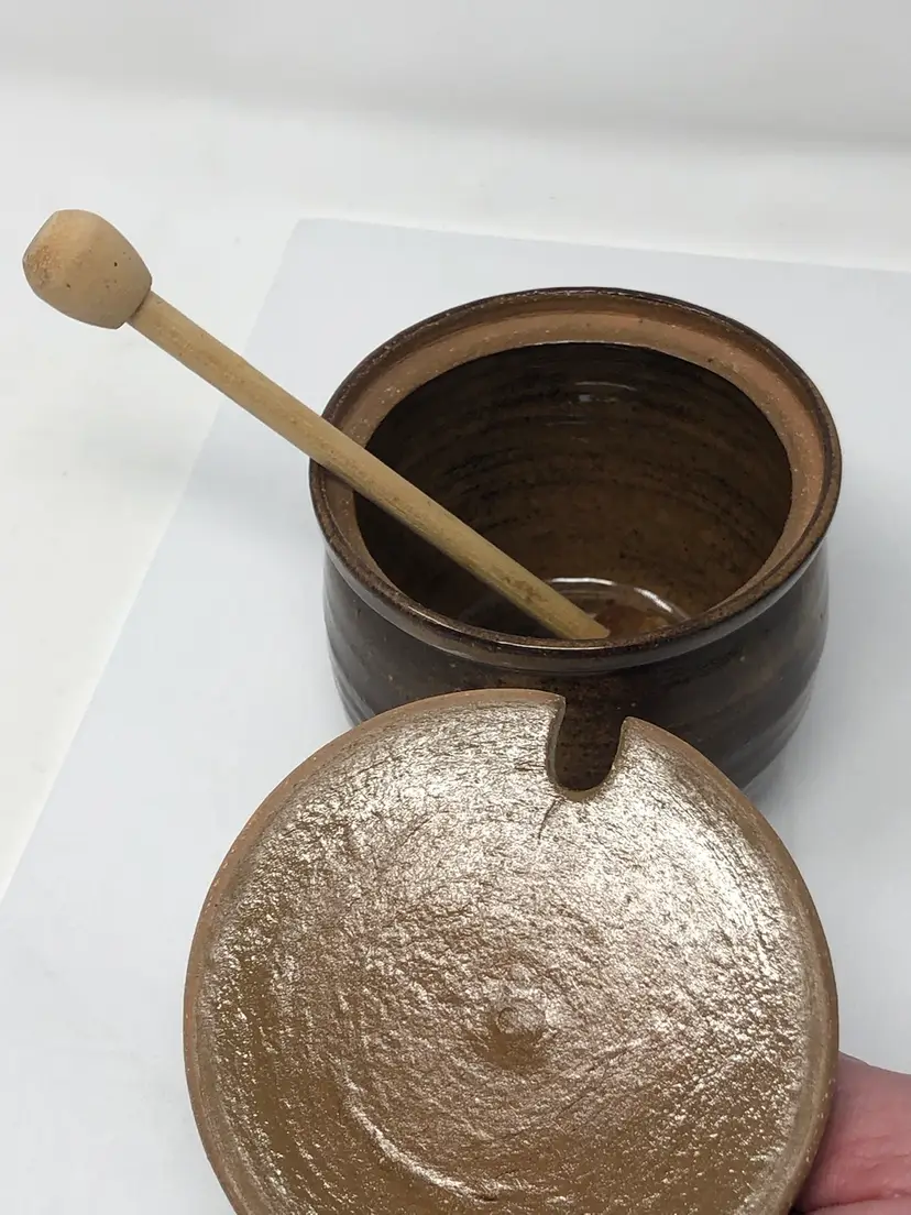 4" handmade pottery honey pot with lid and dipper. Lid has knob handle and cutout for dipper. Artist initials signed on bottom. No chips or cracks