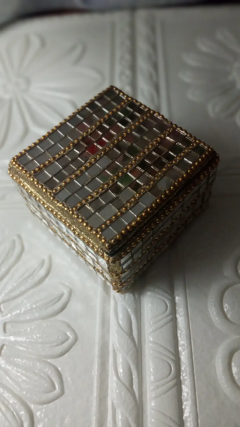 Little Trinket Box approx 3 inches, with the mirror look, little tube beads out lining box material inside box