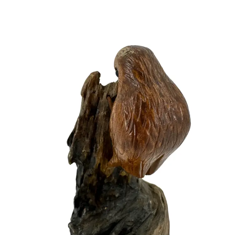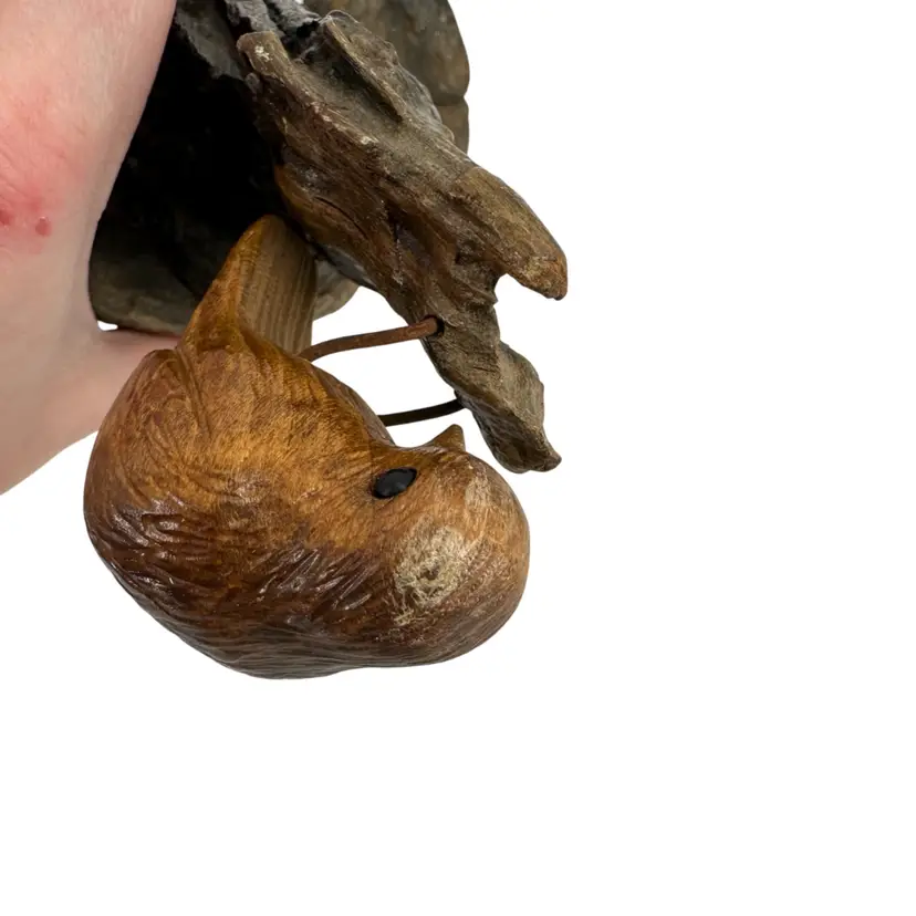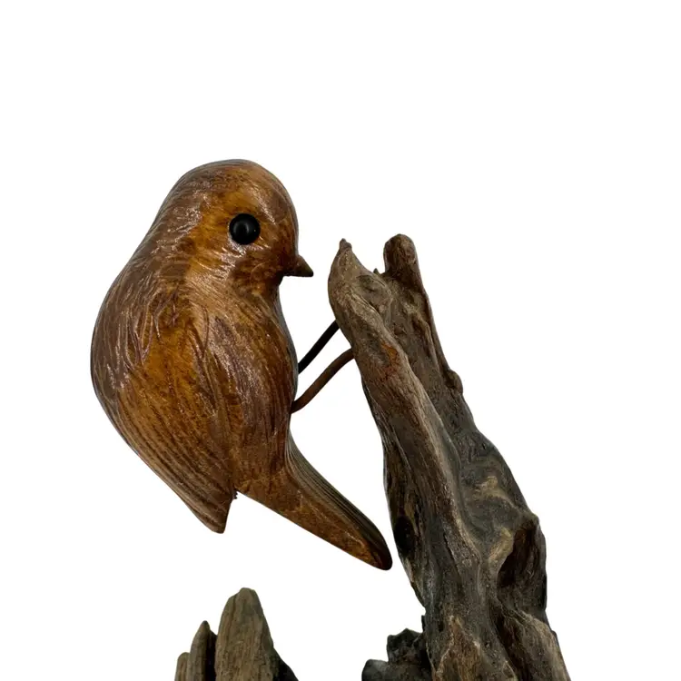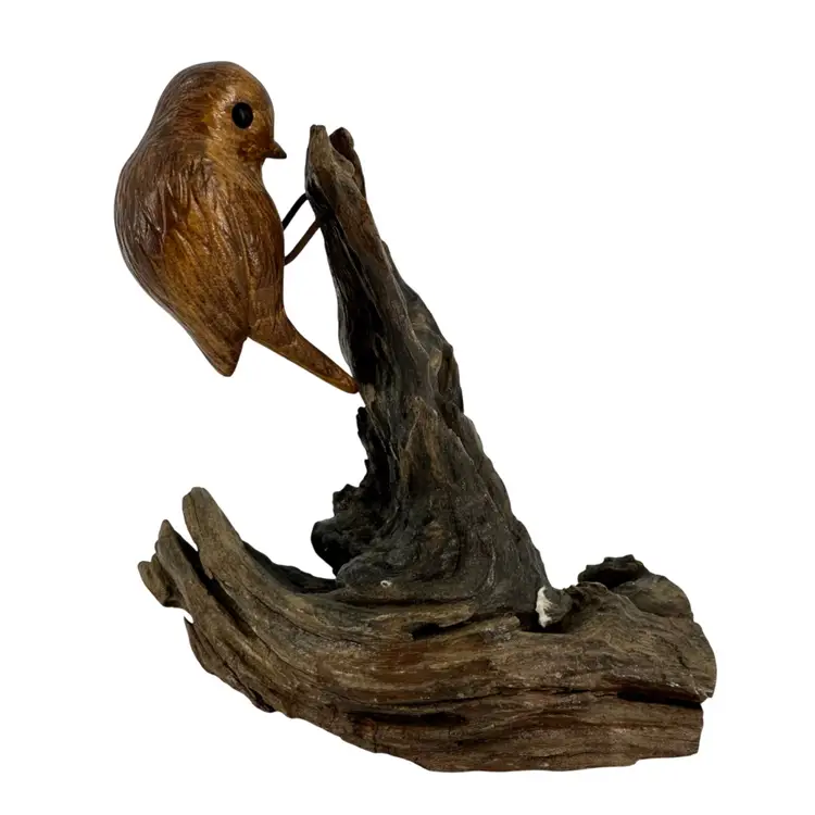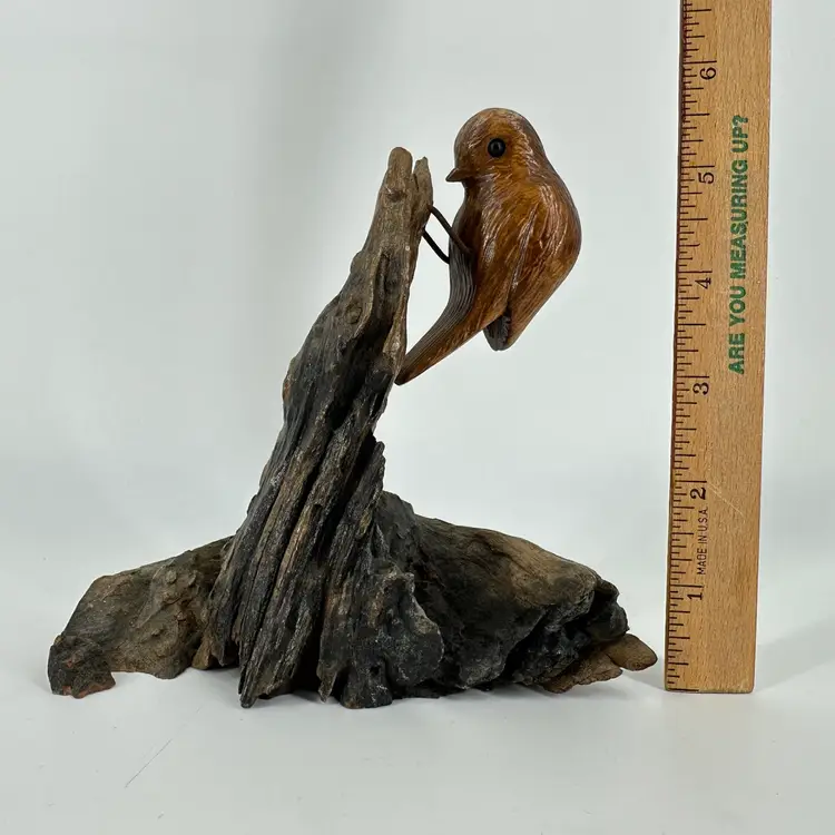 Handcarved applied bird on wood sculpture. Made of live wood. Applied by wired legs. No breaks or cracks. No signatures or markings. Some scuffing on top of birds head and some scratch marks on bottom. Sculpture measures approximately 5 3/4” tall.