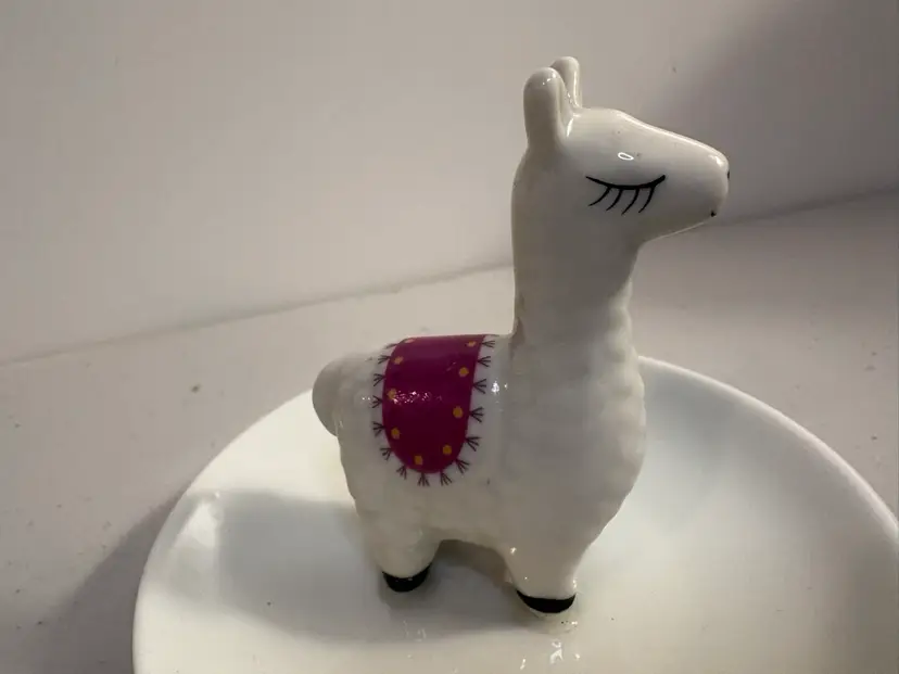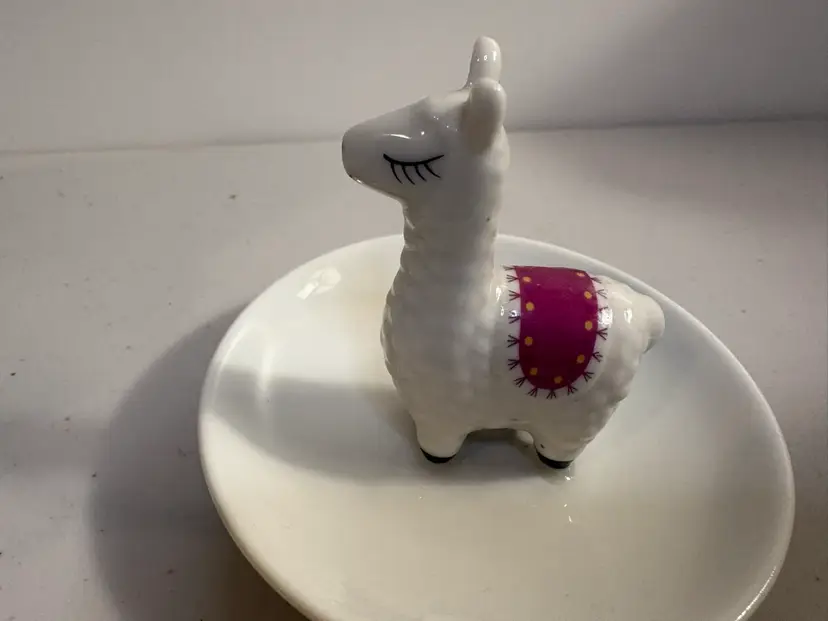 This Llama Boho Ceramic Ring Holder is a charming and functional addition to any jewelry collection. The round white ceramic dish features a winking alpaca design, making it a fun and whimsical piece for organizing rings. With dimensions of 4 x 3 inches, this jewelry organizer is suitable for both men and women and adds a playful touch to the decor. Perfect for showcasing your favorite rings in style, this unique dish is a must-have for animal and nature lovers.
