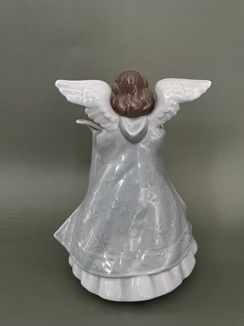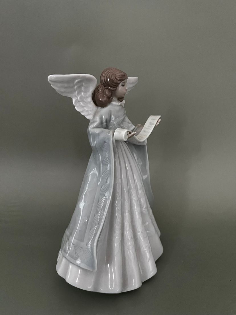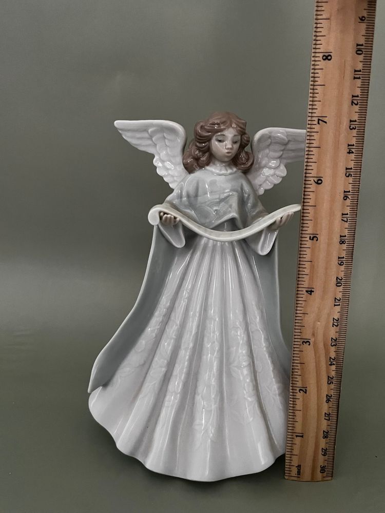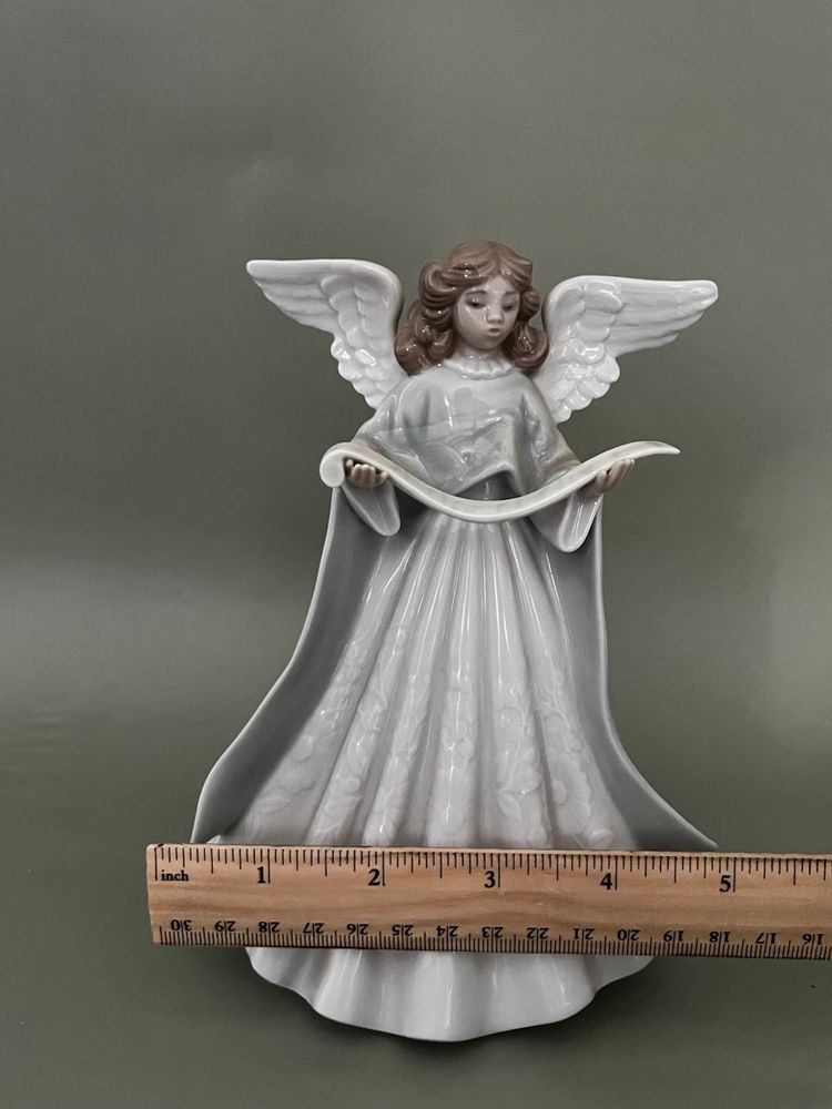 This Lladro figurine from 1990 features a small, multicolor porcelain Angel Navidad Music Tree Topper. The scroll pattern and Spanish style make it a charming addition to any room, especially at Christmas time. This limited edition collectible is a retired piece from the Lladró brand, adding uniqueness and nostalgia to your decor. Made in Spain, this glossy finished figurine captures the theme of Angel and Music perfectly, making it a special item for collectors of decorative sculptures and figurines.