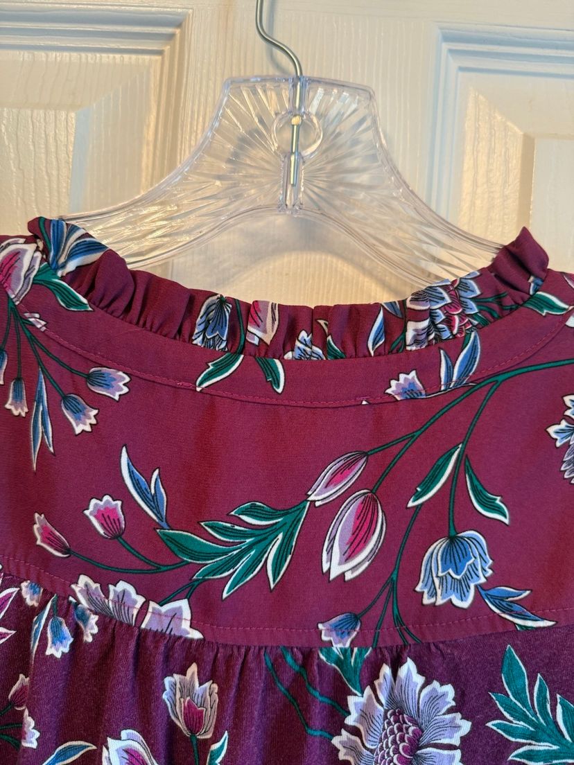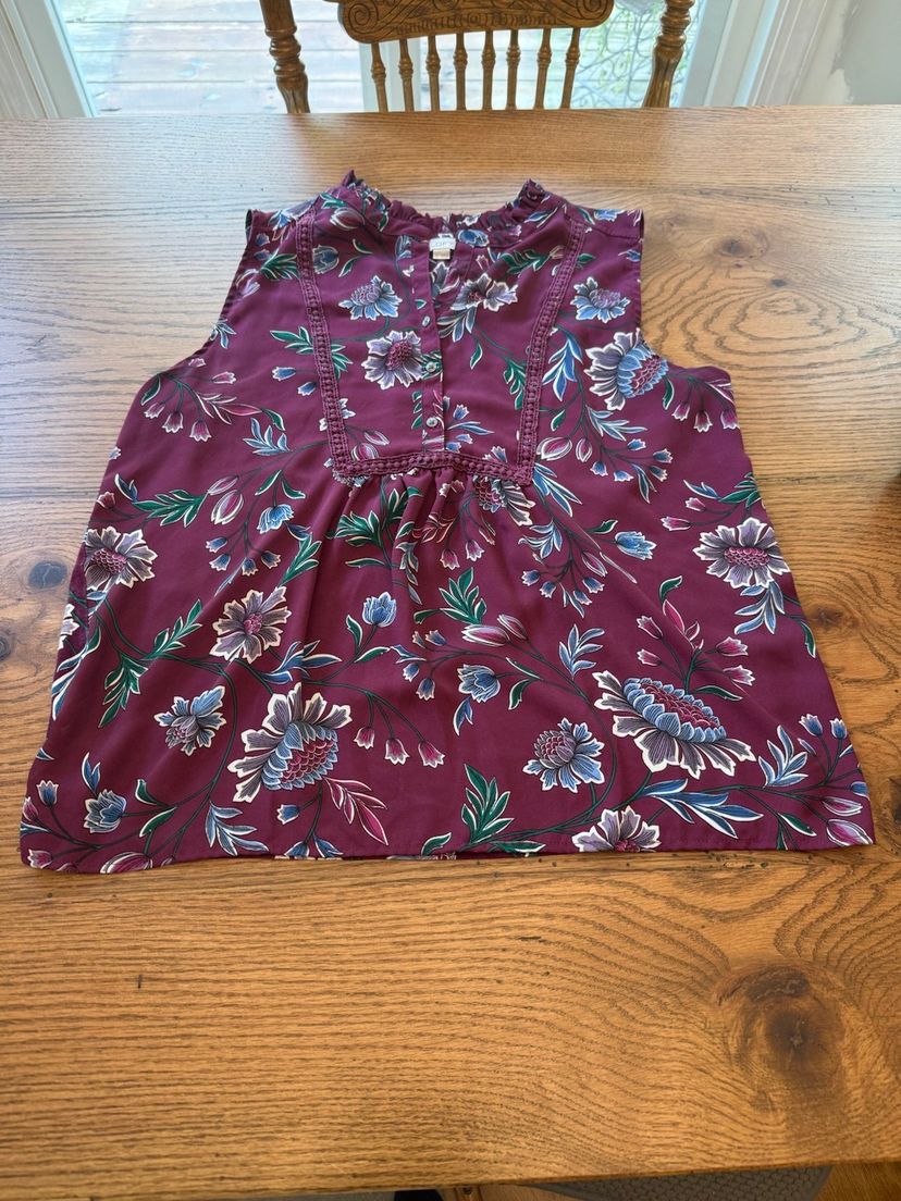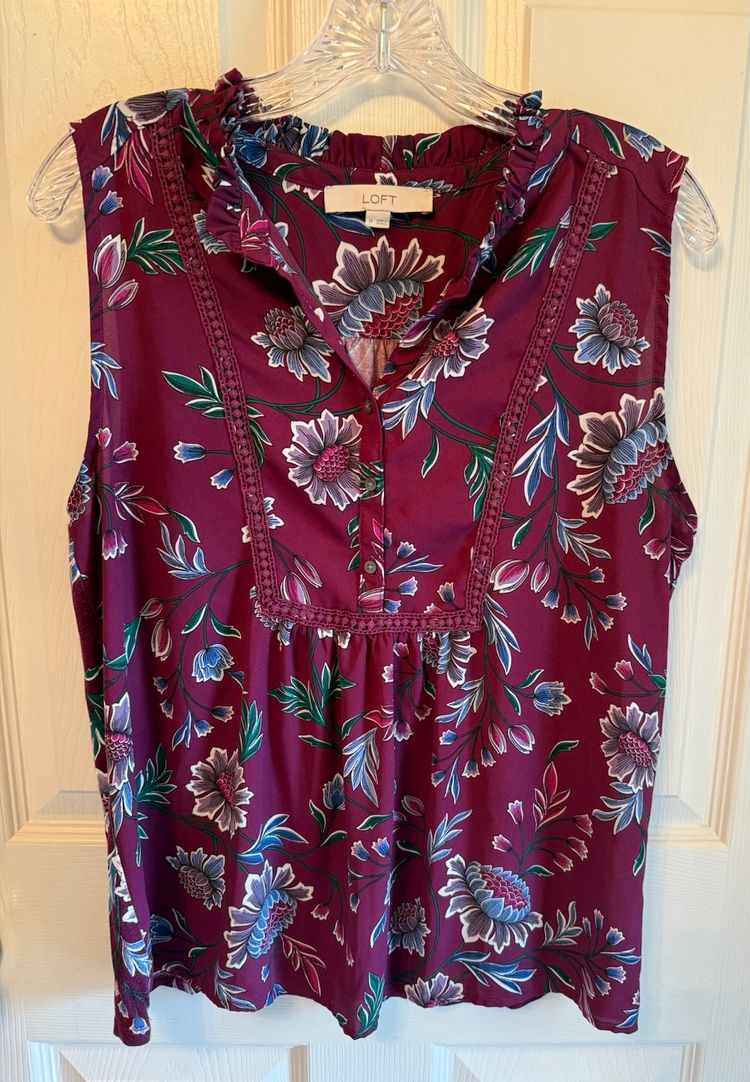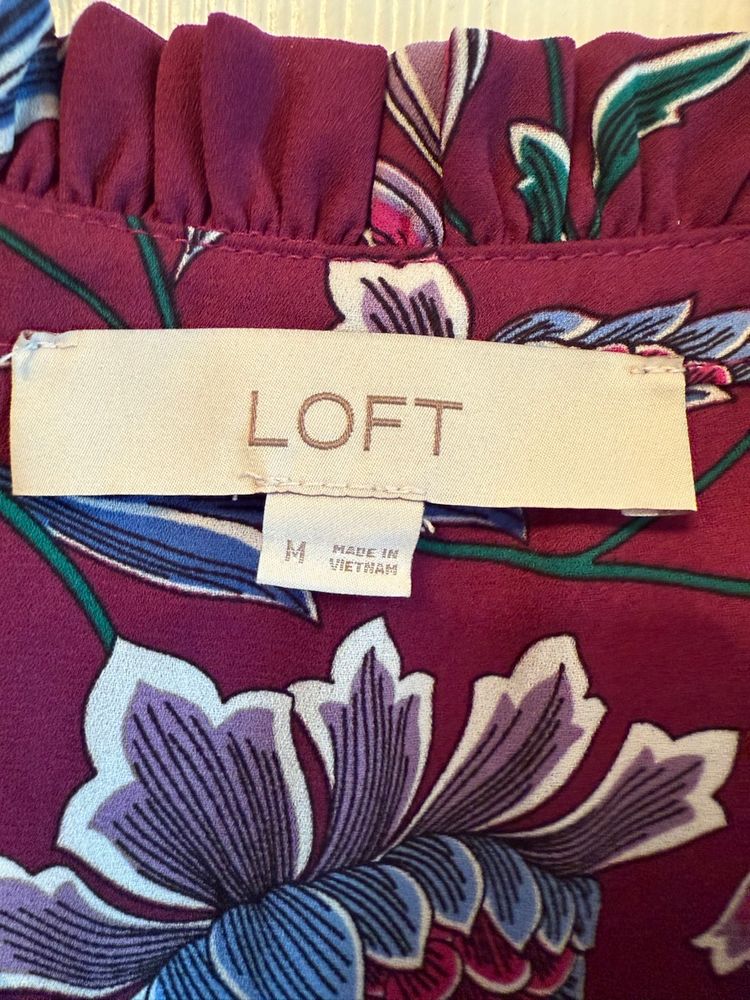 This stylish blouse from LOFT features a sophisticated tie front and a chic mandarin collar. Purple flowered loft. size medium Measurements: 19 inches pit to pit from shoulder to the bottom of the shirt is 23 3/4 inches.