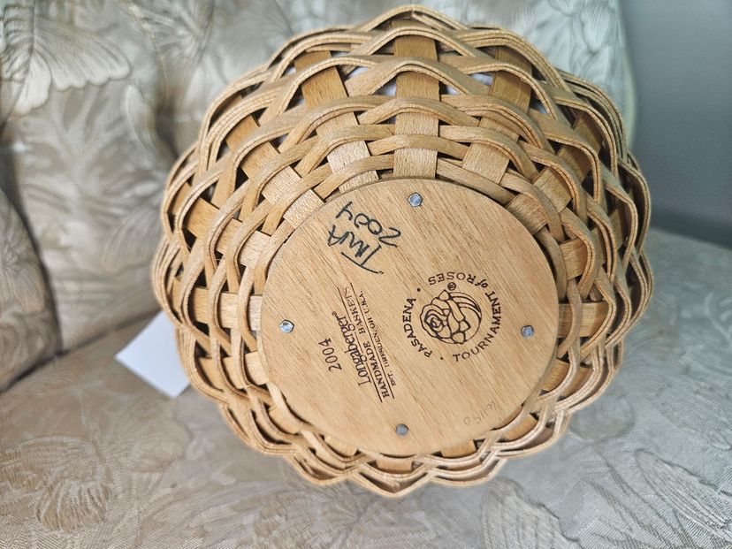 It is a special edition basket that was featured on a float in the 2004 Pasadena Tournament of Roses Parade. The basket is part of the "Let Me Call You Sweetheart" collection. It is a small, round, handwoven basket made in the USA. The basket features a red-colored rim with pewter rose medallions. It is a retired and discontinued piece, making it a collector's item. The basket is often sold with a fabric liner and a plastic protector. Comes with the extras inside still in plastic.