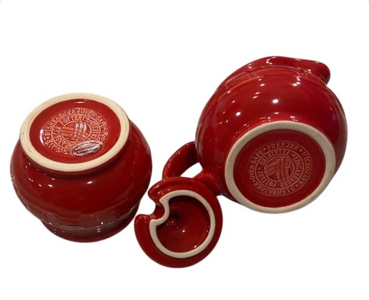 The Longaberger Pottery Woven Traditions Tomato Red Creamer & Sugar Bowl with Lid Set is a traditional ceramic set made in the United States. This original set includes a creamer, sugar bowl with lid, and features a woven pattern in a paprika color. Perfect for collectors or those looking to add a touch of elegance to their kitchen or dining room, this Longaberger set is a timeless piece that brings a sense of craftsmanship and quality to your home.