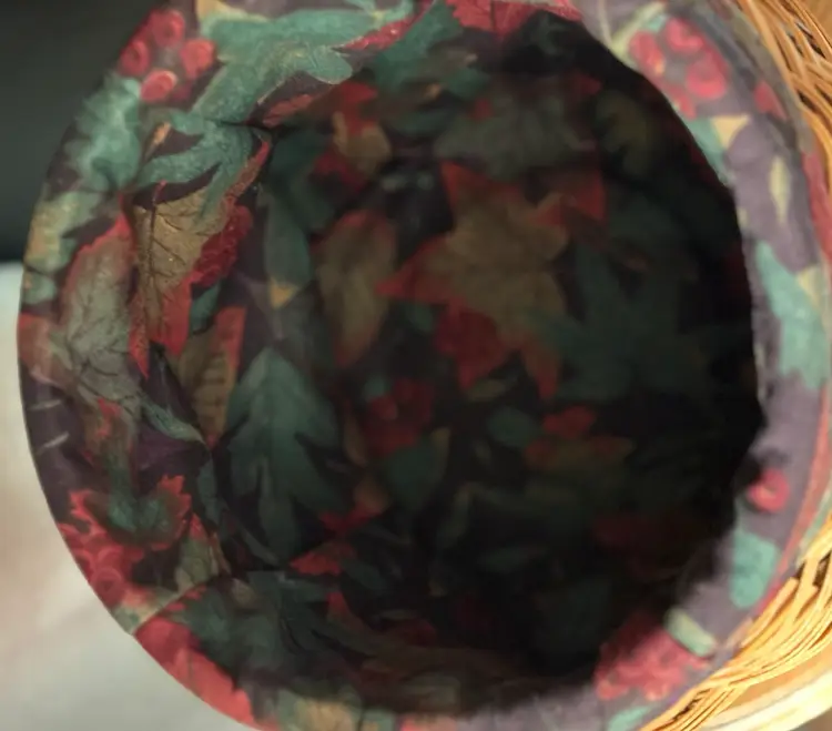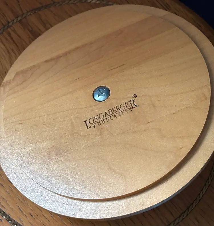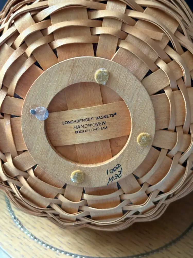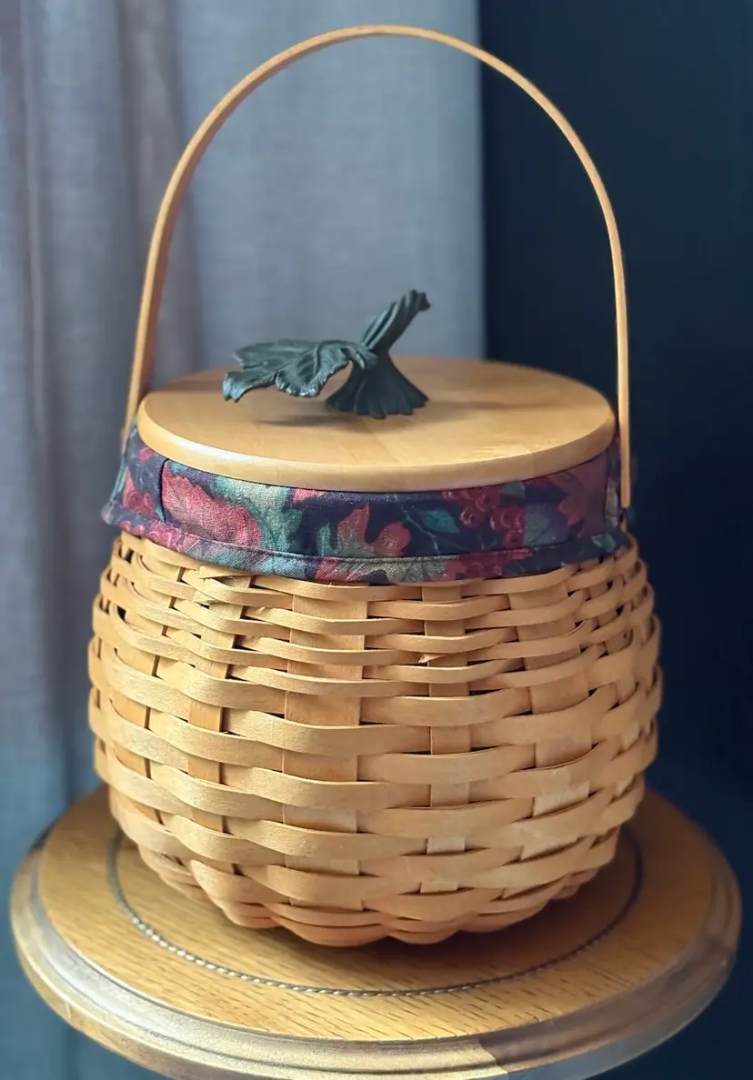 2001 Longaberger Basket has wooden lid with wrought iron leaf stem. 12in high 8in wide.