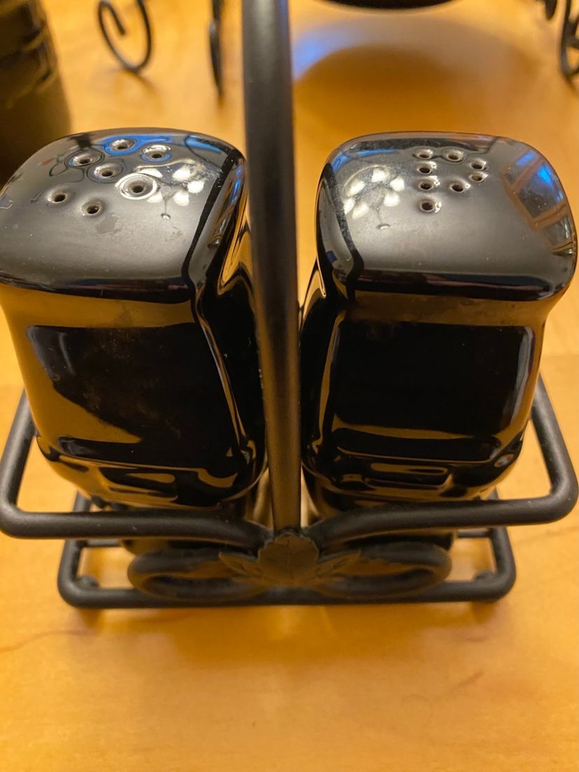 This is a 3 piece set of black onyx LONGABERGER ceramic salt and pepper shakers in a LONGABERGER wrought iron caddy. The salt and pepper shakers are marked LONGABERGER and look absolutely brand new! This will add charm to any dinner table.