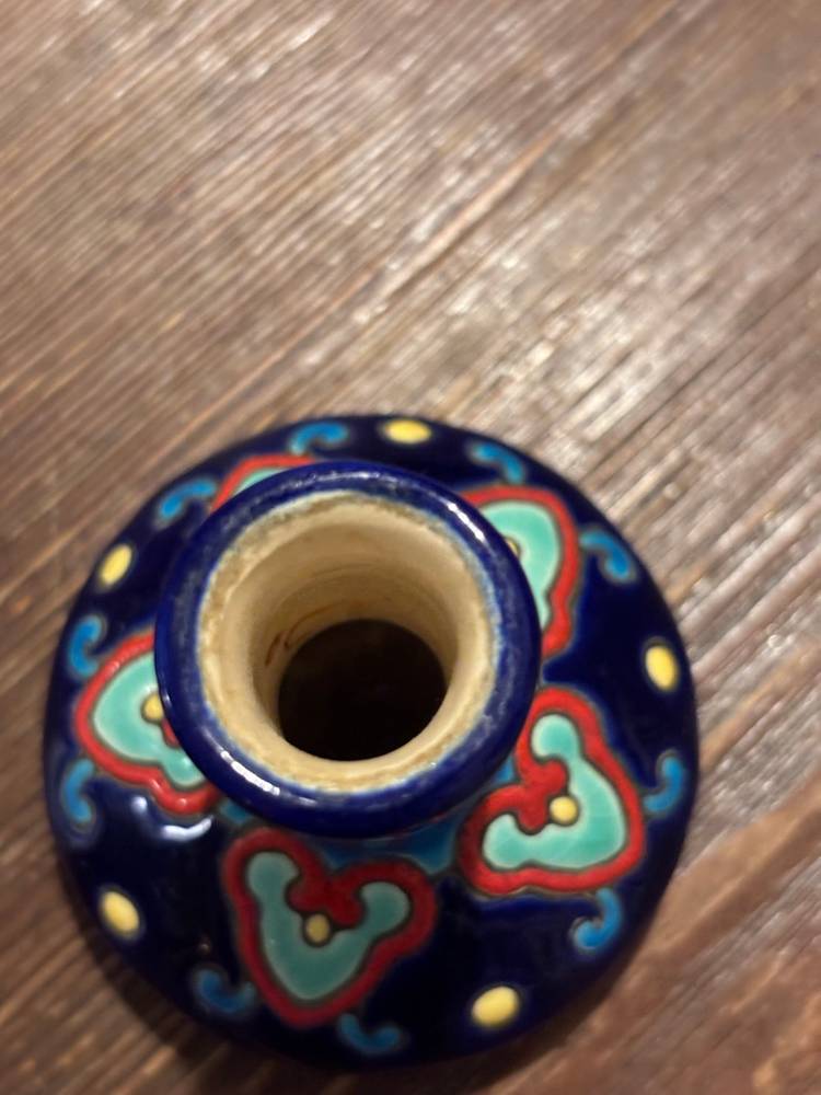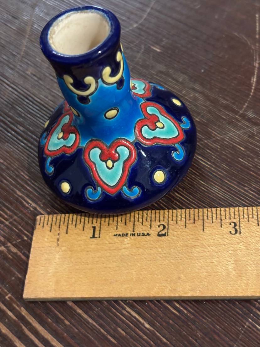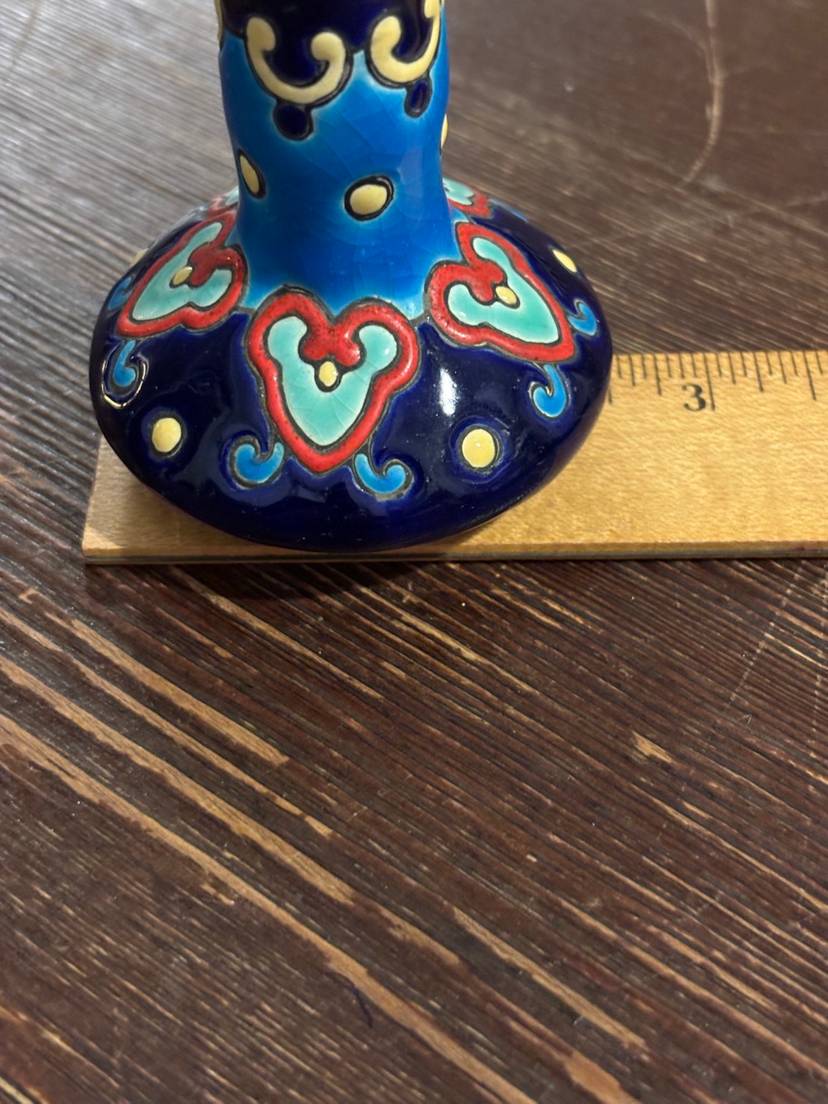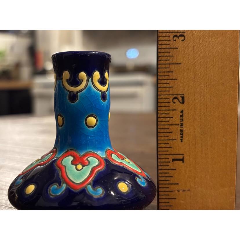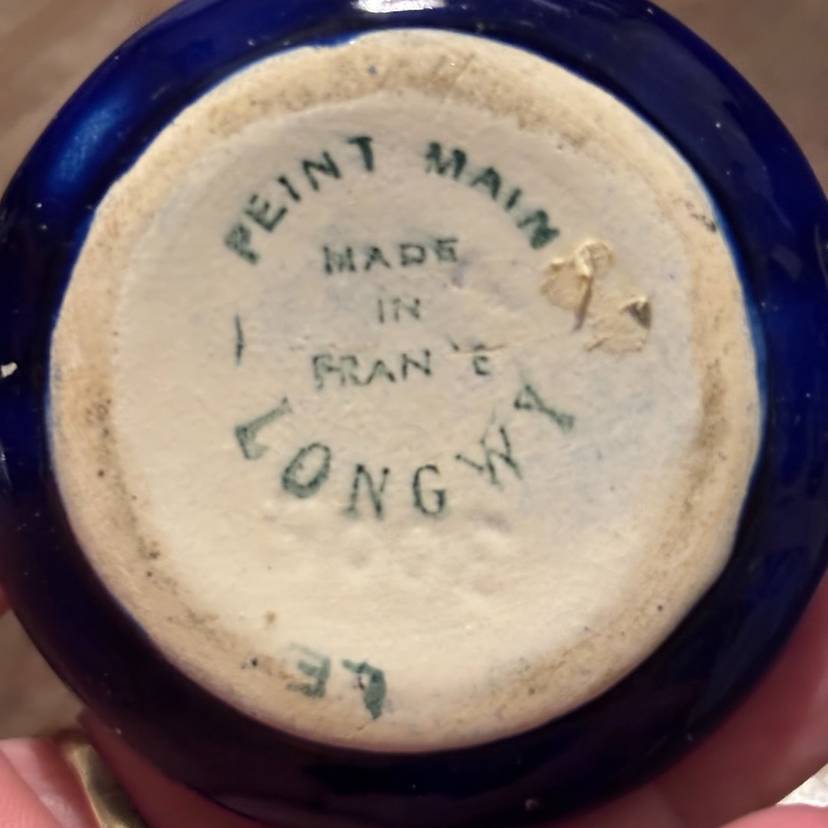 Approx.2.75” tall “Peint Main” translated from French is “Painted Hand” or Hand Painted This piece made in France is a very RARE find Beautiful rich and bright colors! These pieces originated from the late 1700’s Longwy Art Deco French Ceramic Vase Longwy is a town in France known for its unique tradition of enameled ceramics, particularly in the Art Nouveau and Art Deco eras. Unlike traditional Chinese cloisonné which uses metal bands, Longwy developed a method of creating deep lines in the clay surface to form outlines, which are then filled with rich enamel colors before firing. Longwy pieces are often characterized by their vibrant colors, particularly cobalt and turquoise, and a distinctive crackle finish (craquele). Characteristics of the Art Deco period, including its shape and the use of contrasting colors and possibly geometric patterns. This piece could possibly be antique (100+ years old)! I found one in my search and it is posted for $125