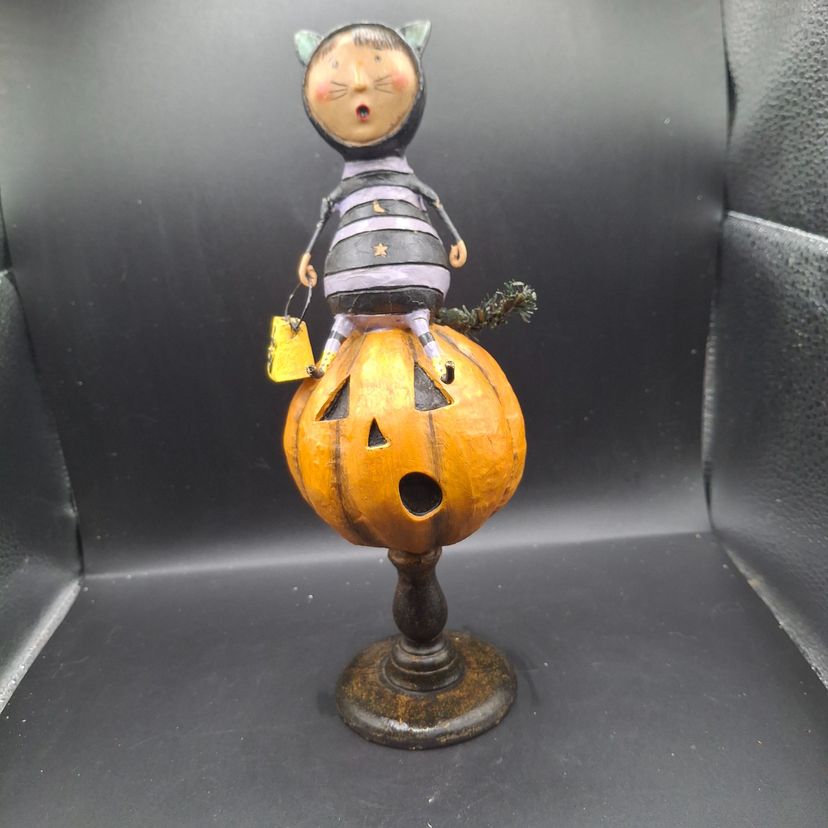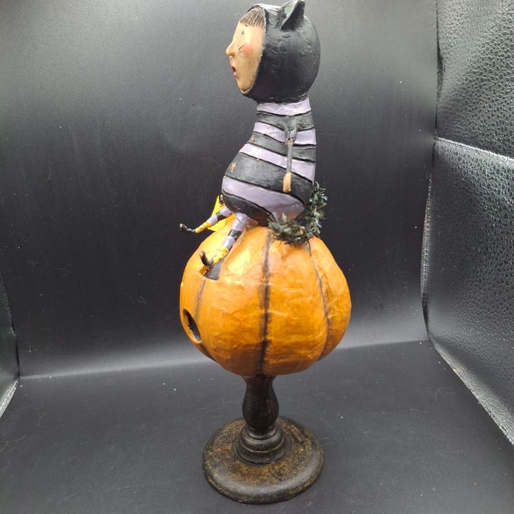 In the heart of Halloween, a little cat girl perches atop a pumpkin, casting a whimsical spell. Her striped attire, complete with a tiny tail and ears, invites onlookers into a playful, enchanting world. This delightful figurine, with its charming details, is a tale of Halloween magic and childlike wonder.