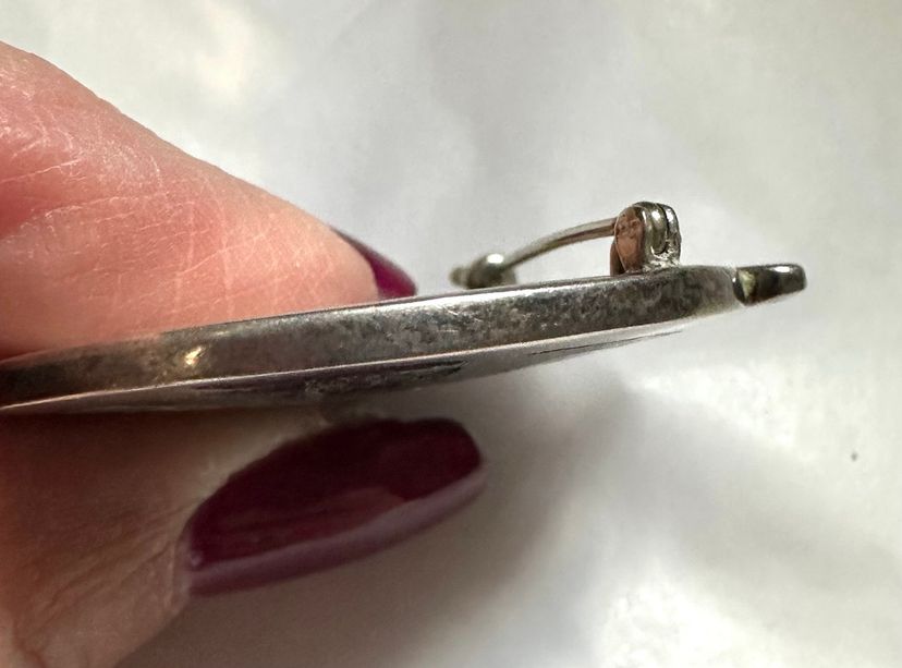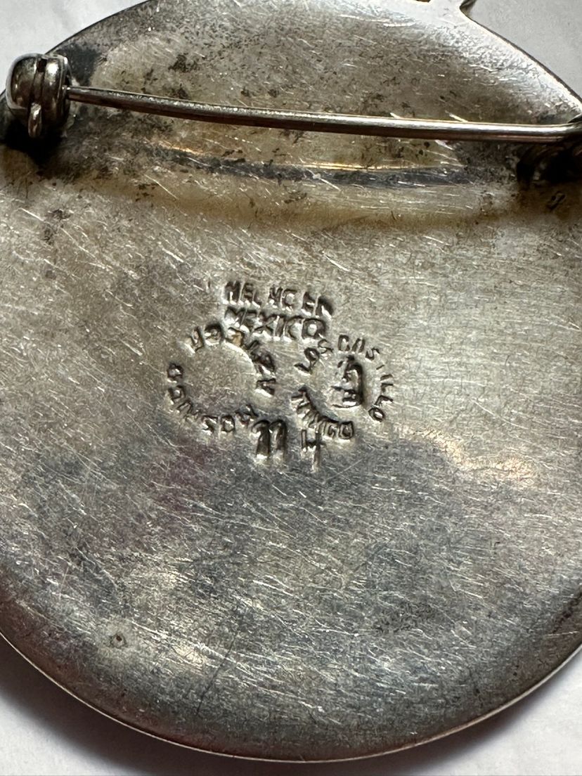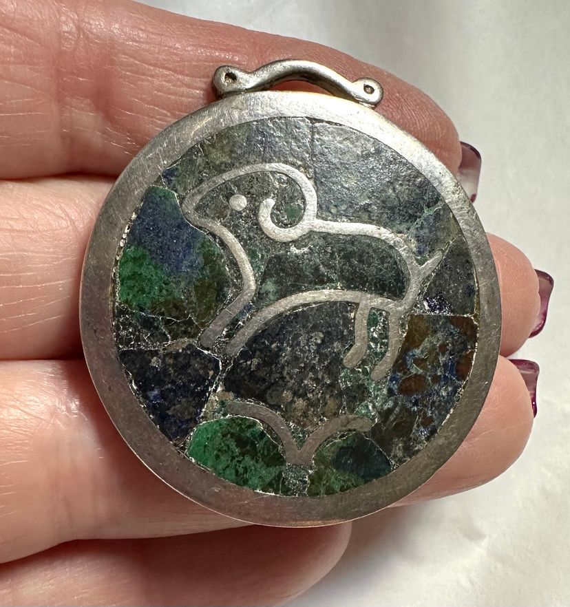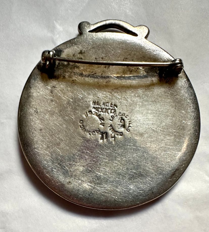 Nice early piece of Los Castillo jewelry made in Mexico. It is sterling silver with natural stone pieces. It depicts the astrological Aries sign, the ram. It is 1.5” in diameter and weighs 22 grams. It is in very good condition.