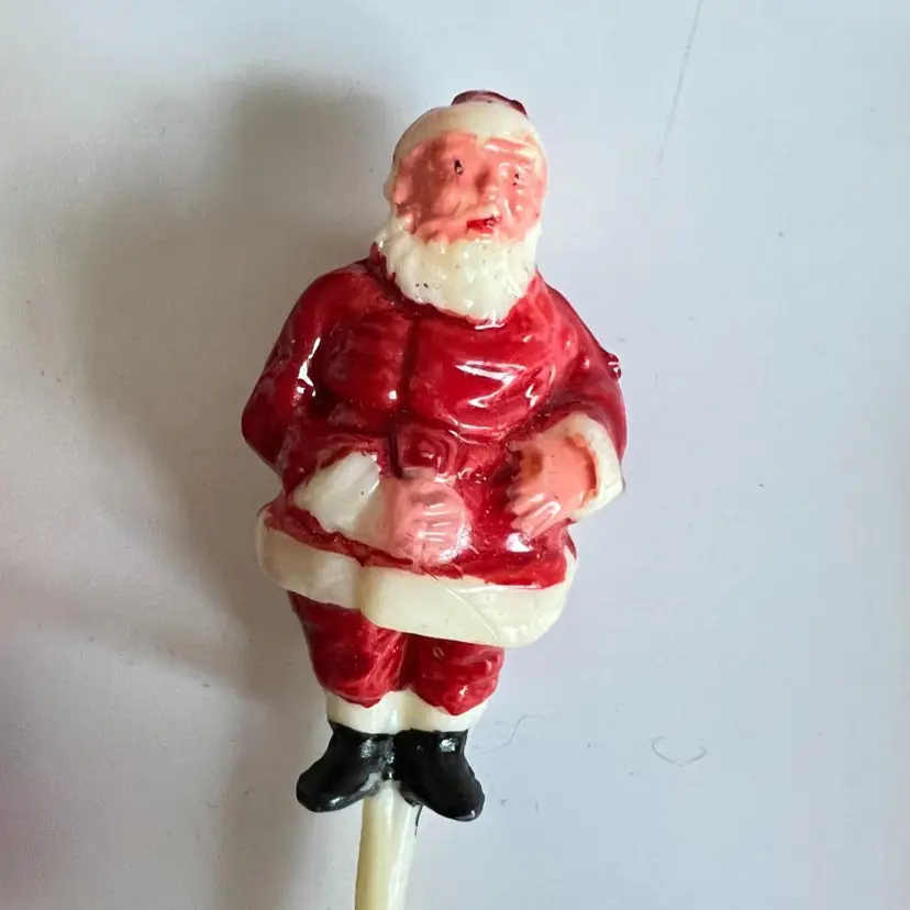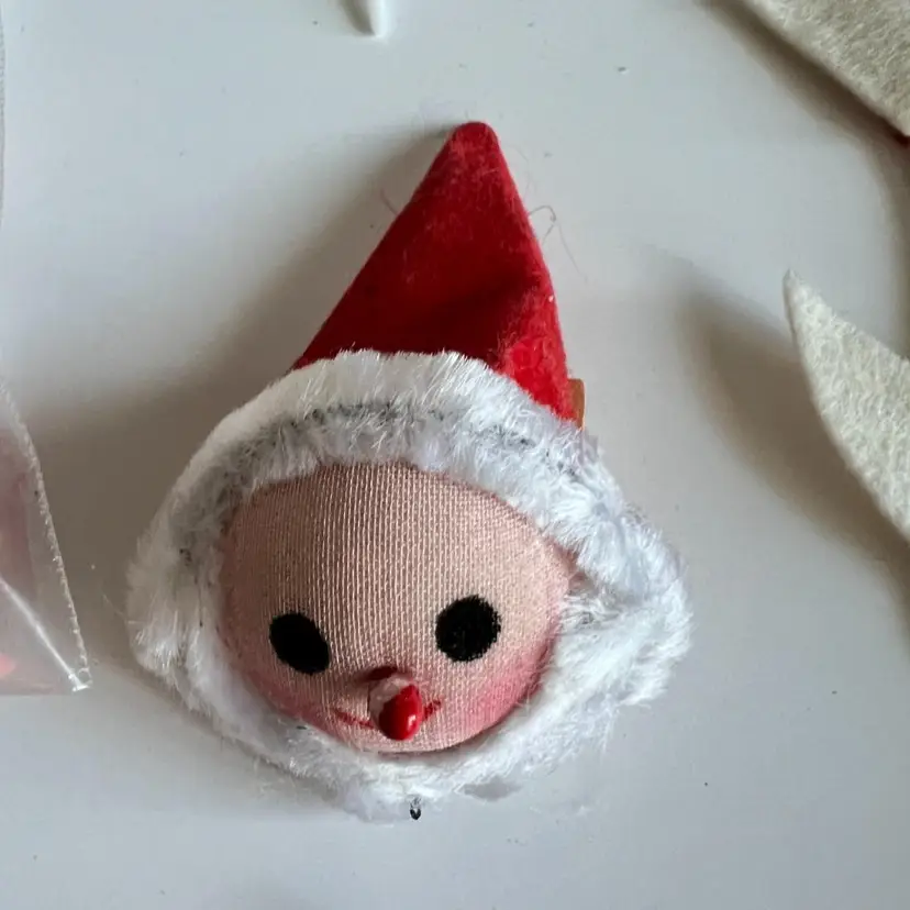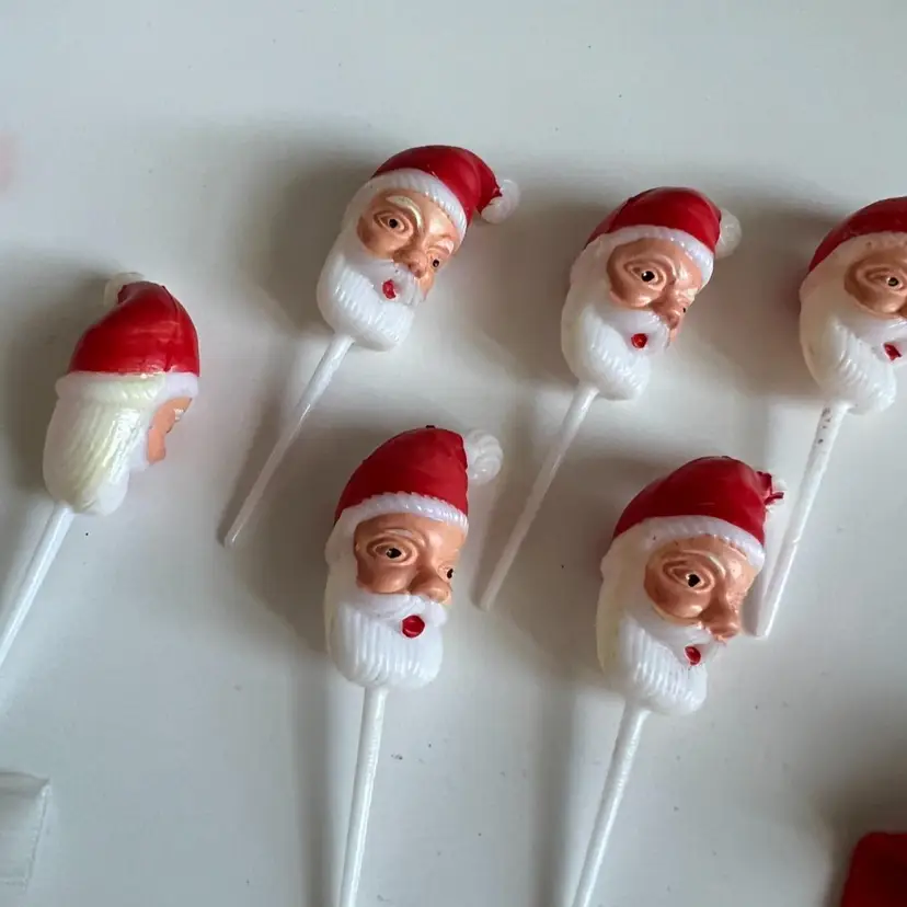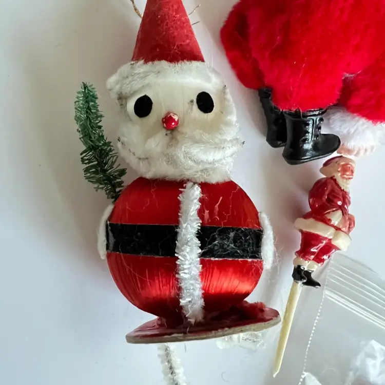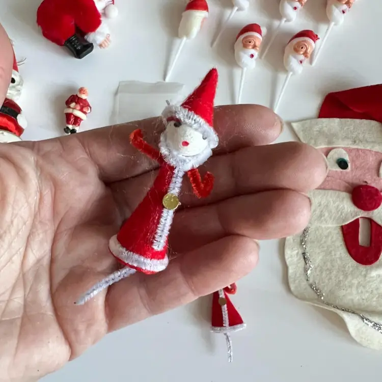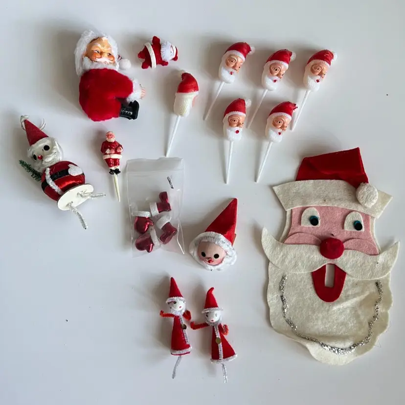 Includes 1 furry Santa squeeze clip 6 plastic santa head cupcake picks 1 plastic santa full body cupcake pick 1 mini flocked santa with chenille beard 1 felt santa light switch cover 1 round head santa 2 spun head santa pics 1 satin ball santa Mini plastic Santa boots and mittens charms