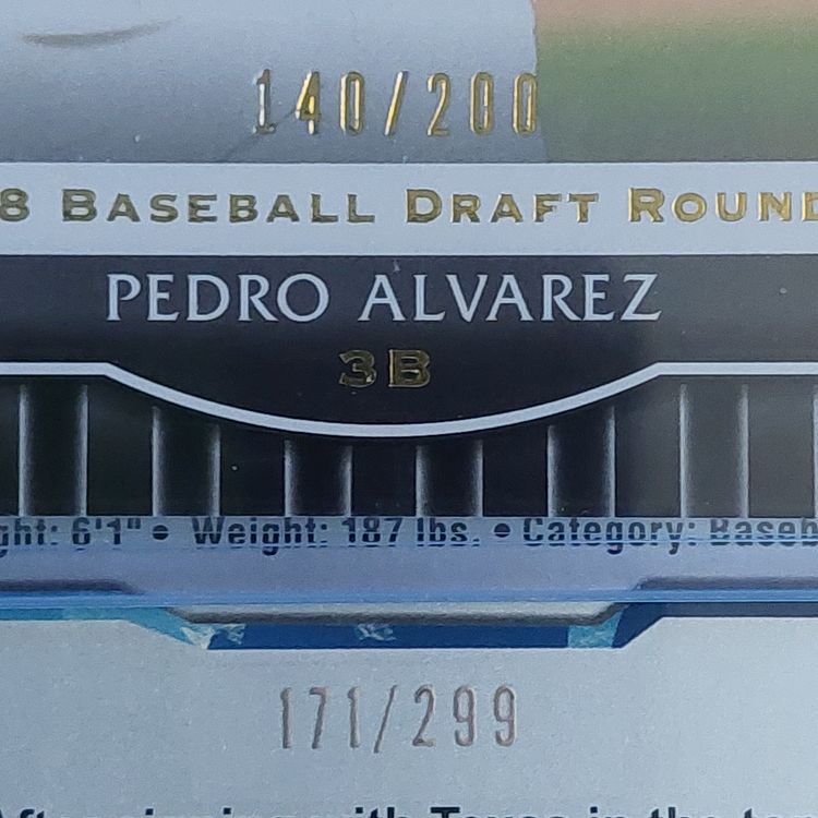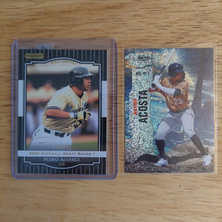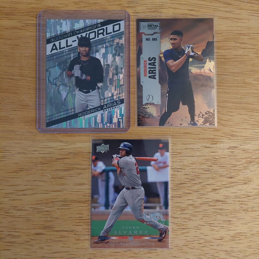 Bryan Acuna auto #81/99. 2021 Leaf Flash navy parallel. Pedro Alvarez 2008 Razor signature series black Parallel #140/200. Maximo Acosta 2022 Skybox Metal Universe Champions silver dots Parallel #171/299. Roderick Arias 2022 Upper Deck Goodwin Champions all world Insert. Pedro Alvarez 2008 Upper Deck USA Baseball Insert.