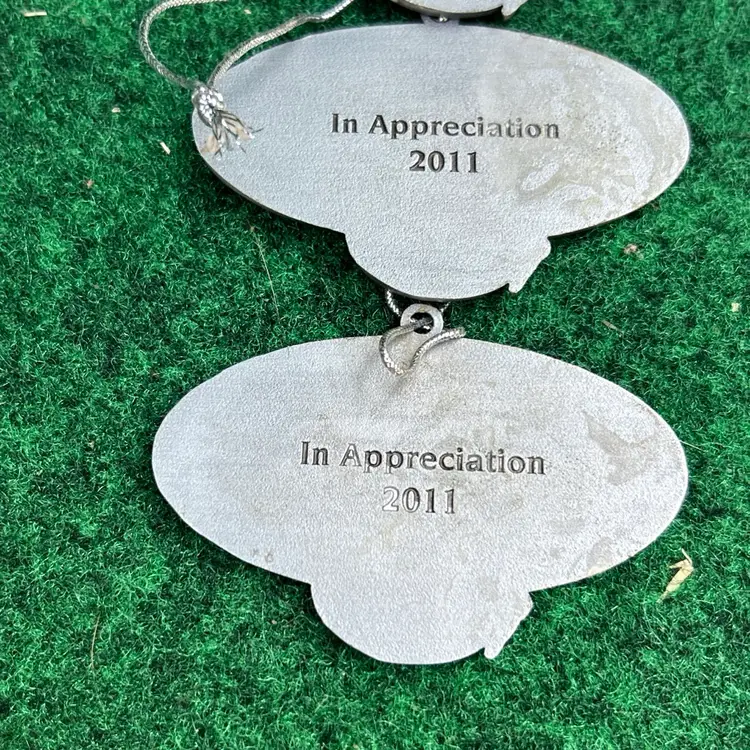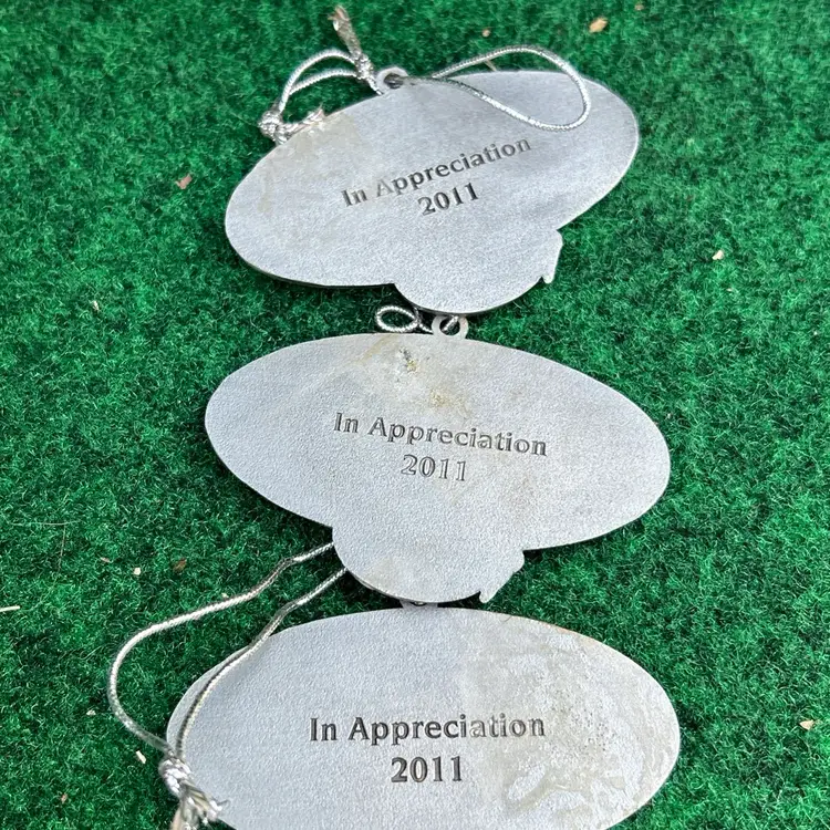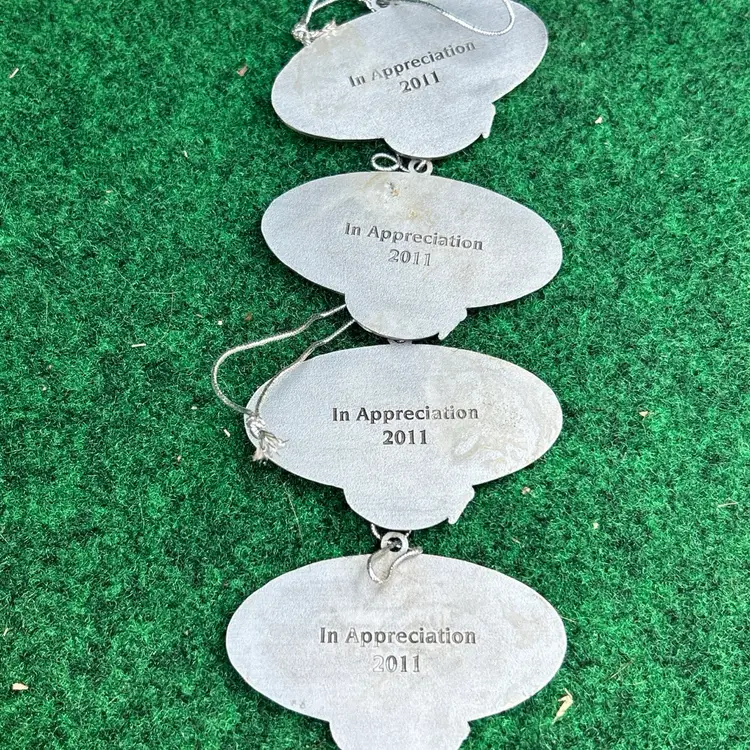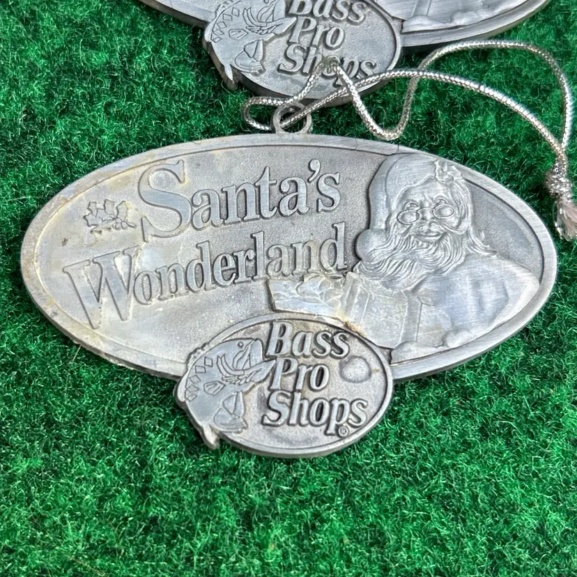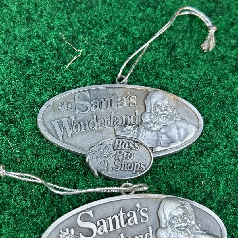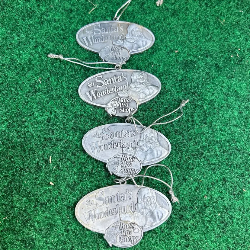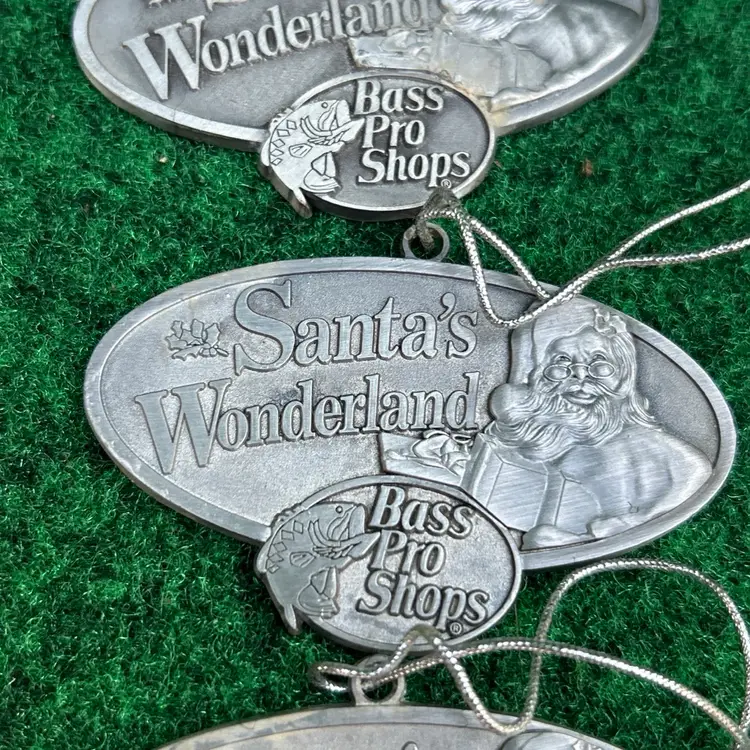 This lot of 4 Bass Pro Shops Santa's Wonderland 2011 Christmas ornaments are crafted from pewter and feature an oval shape design. Each ornament depicts Santa Claus, perfect for adding a touch of festive charm to any Christmas tree. These original ornaments are a great addition to any holiday decor collection and are suitable for recipients of all ages. Made in the United States, these medium-sized ornaments from the Santa franchise are a timeless piece that captures the spirit of Christmas.