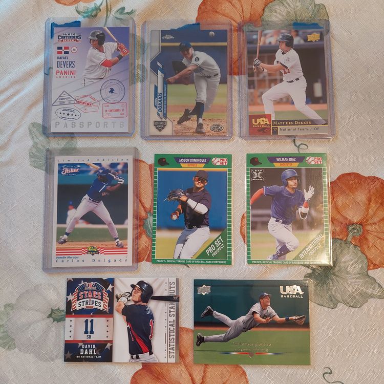 Rafael Devers 2015 Panini Contenders passport Insert. John Doxakis 2020 Topps Pro Debut Chrome. Matt Den Dekker 2008 Upper Deck USA Baseball Insert. Carlos Delgado 1992 Classic Best Fisher Nuts. David Dahl 2015 Panini USA Baseball Stars And Stripes statistical standouts. Jordan Danks 2008 Upper Deck USA Baseball Insert.