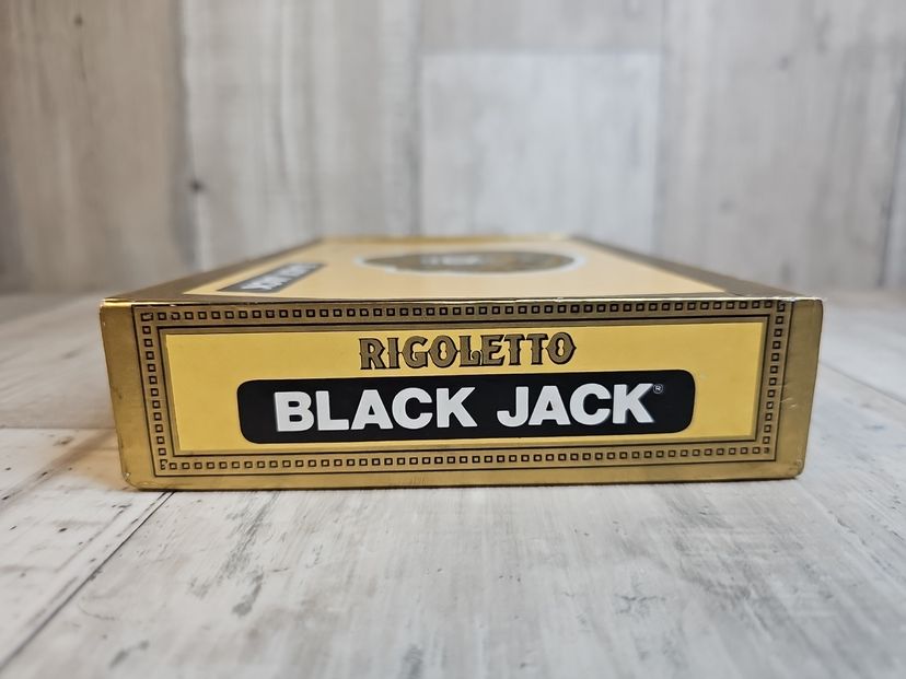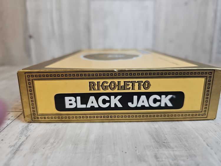 A beautiful lot of five matching vintage Rigoletto Black Jack wooden cigar boxes, stamped Tampa, Florida. These richly colored yellow boxes with gold and black detailing are ideal for collectors, crafters, or retro-style décor.
