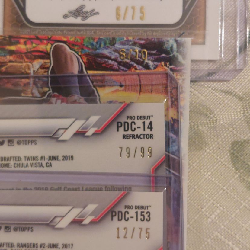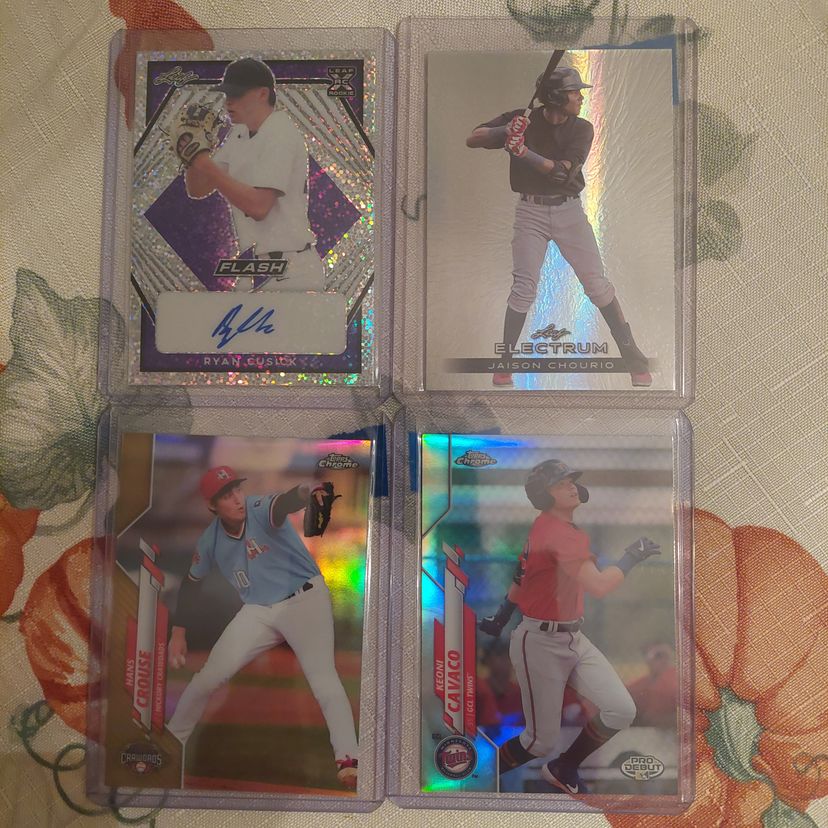 Ryan Cusick auto. #6/75. 2021 Leaf Flash purple Parallel. Jaison Chourio 2024 Leaf Electrum #6/10. Hans Crouse 2020 Topps Chrome Pro Debut gold Refractor #12/75. Keoni Cavaco 2020 Topps Chrome Pro Debut Refractor #79/99.