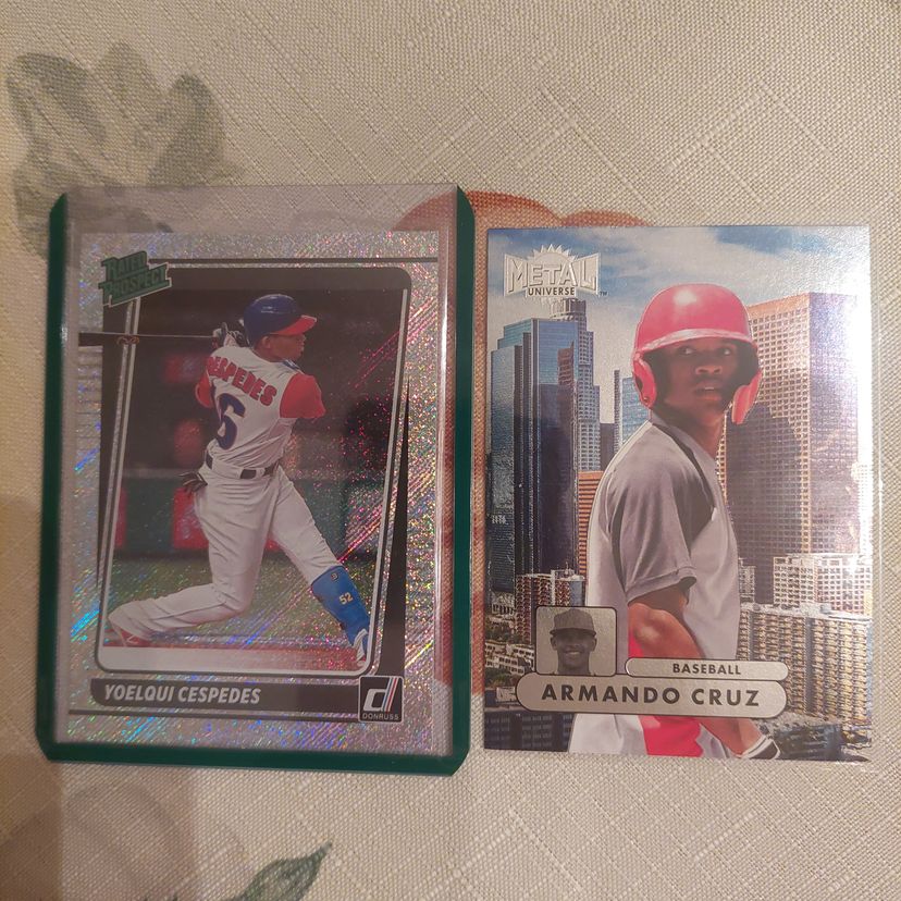 Armando Cruz 2022 Skybox Metal Universe Champions 97-98 retro Insert. Yoelqui Cespedes 2021 Donruss Rated Prospect Rapture Parallel.