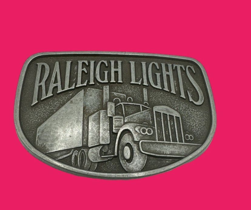These vintage Raleigh belt buckle features an advertising design for Raleigh Lights cigarettes, depicting a semi truck and drivers.