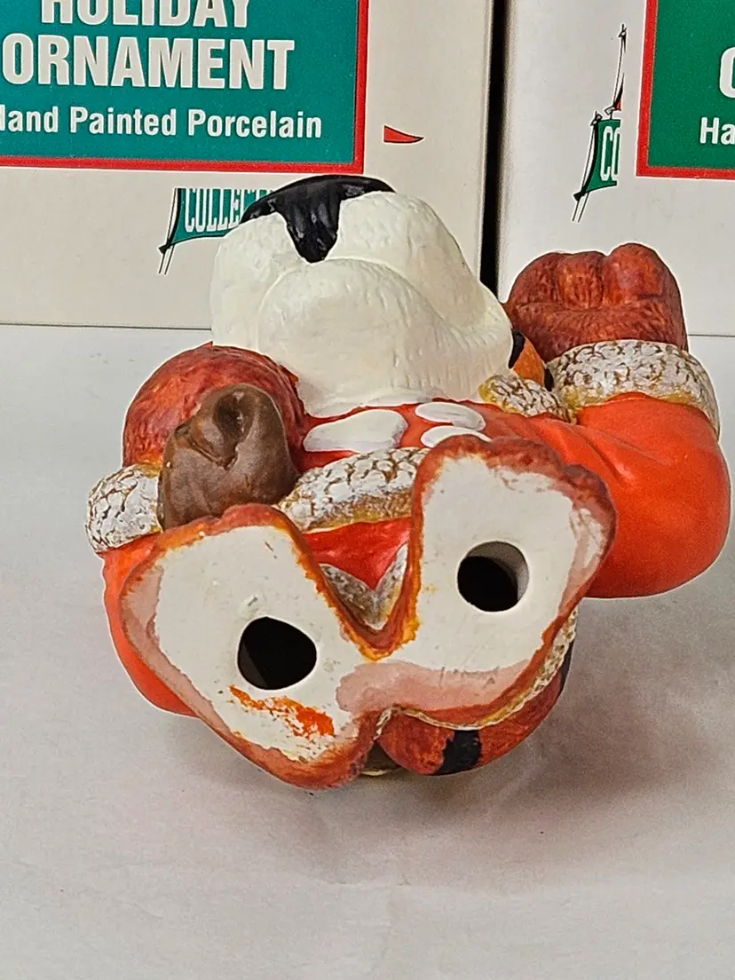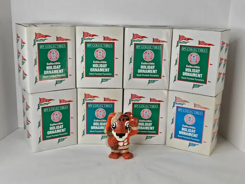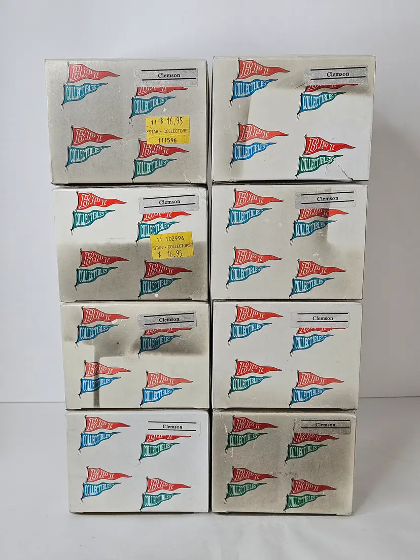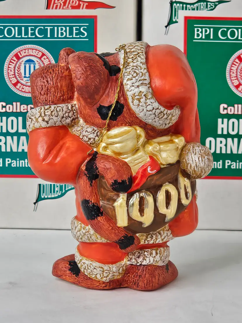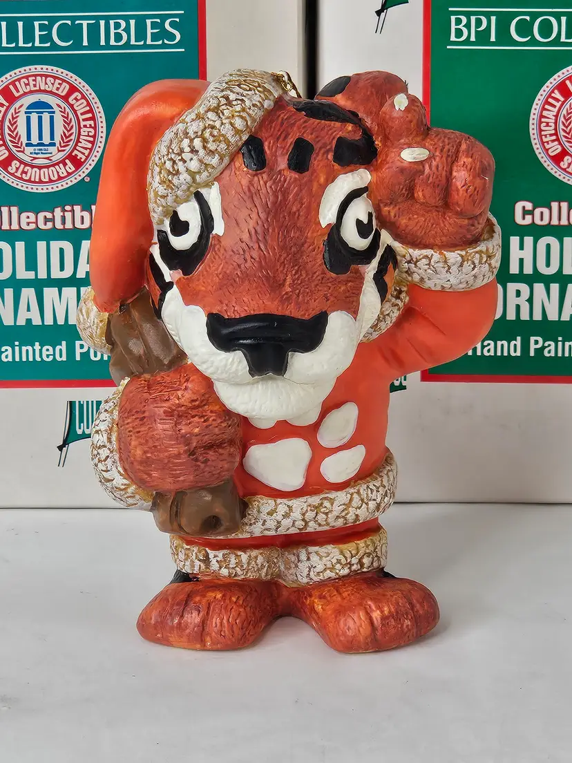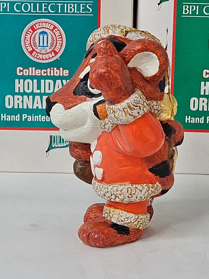 You are buying a Lot of 8 Vintage 1996 Clemson Tigers Mascot Porcelain Holiday Ornaments, They were made by BPI and are Hand Painted in original box. The boxes do have some cosmetic wear present (mostly discoloration) due to storage while ornaments are in unused condition. The ornament measures about 4.25 inches tall.