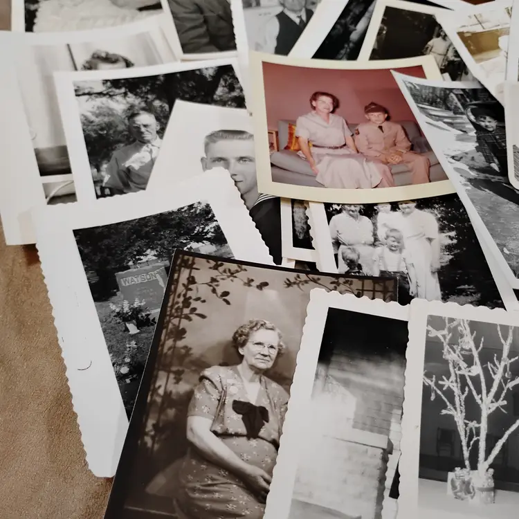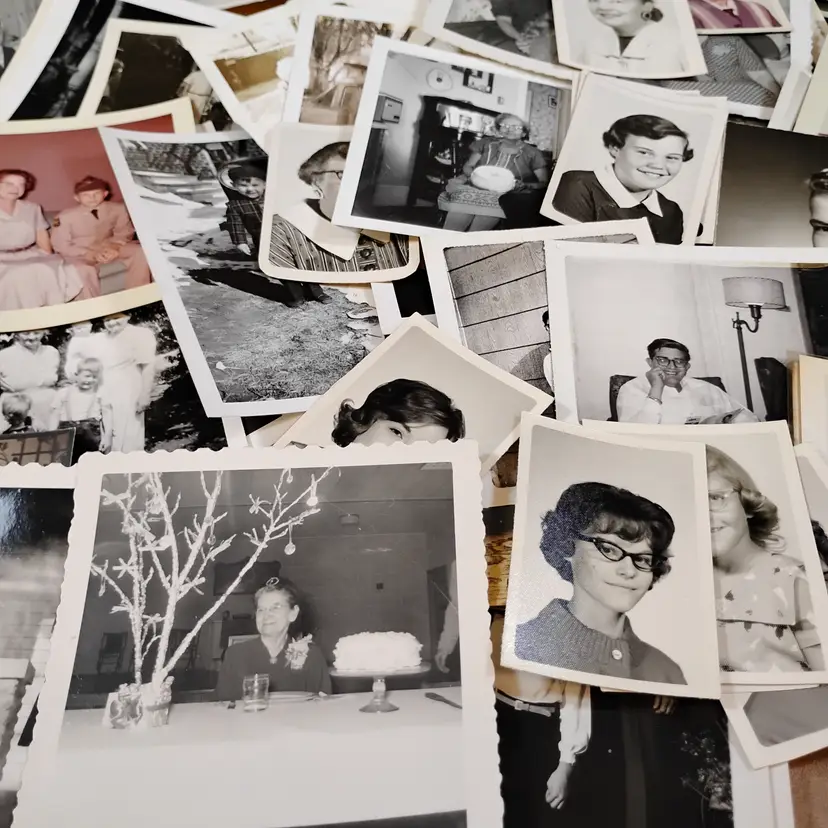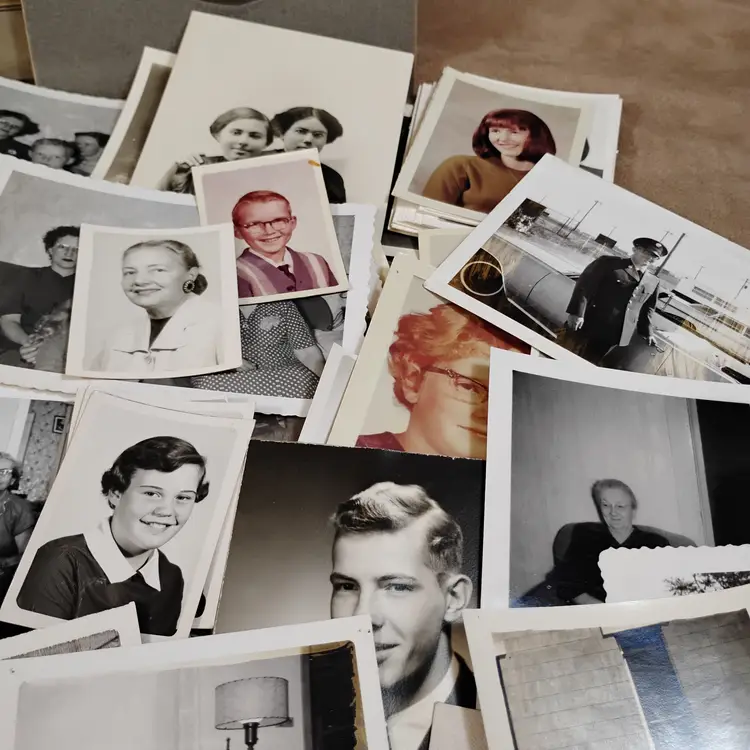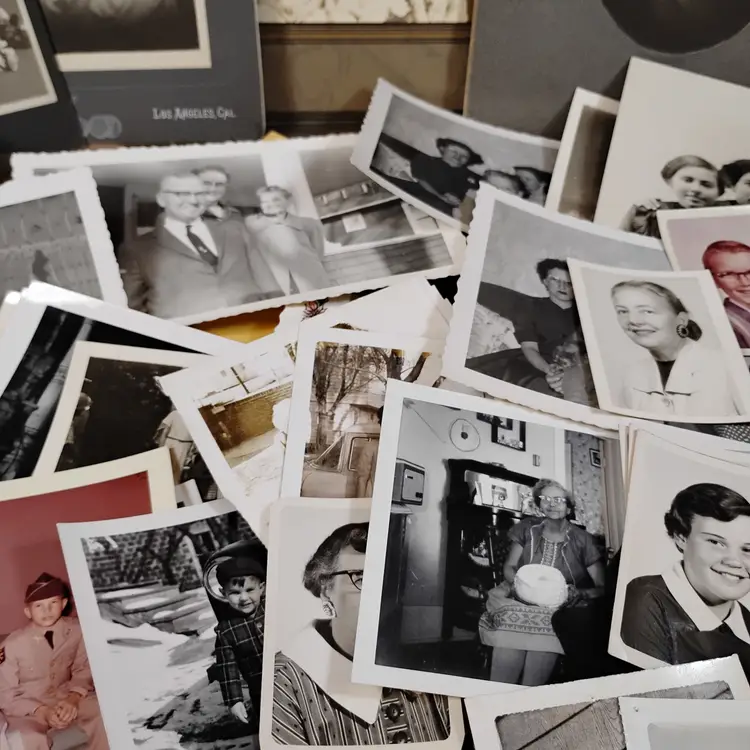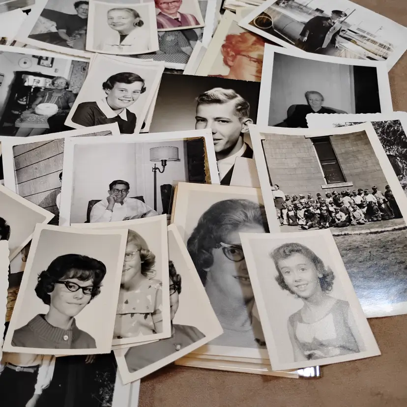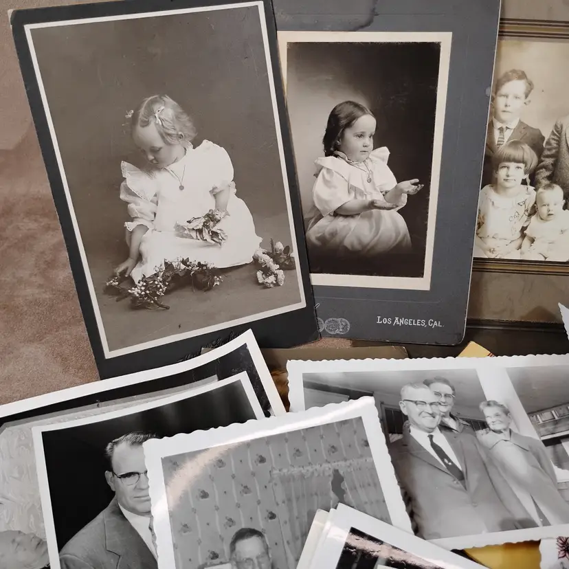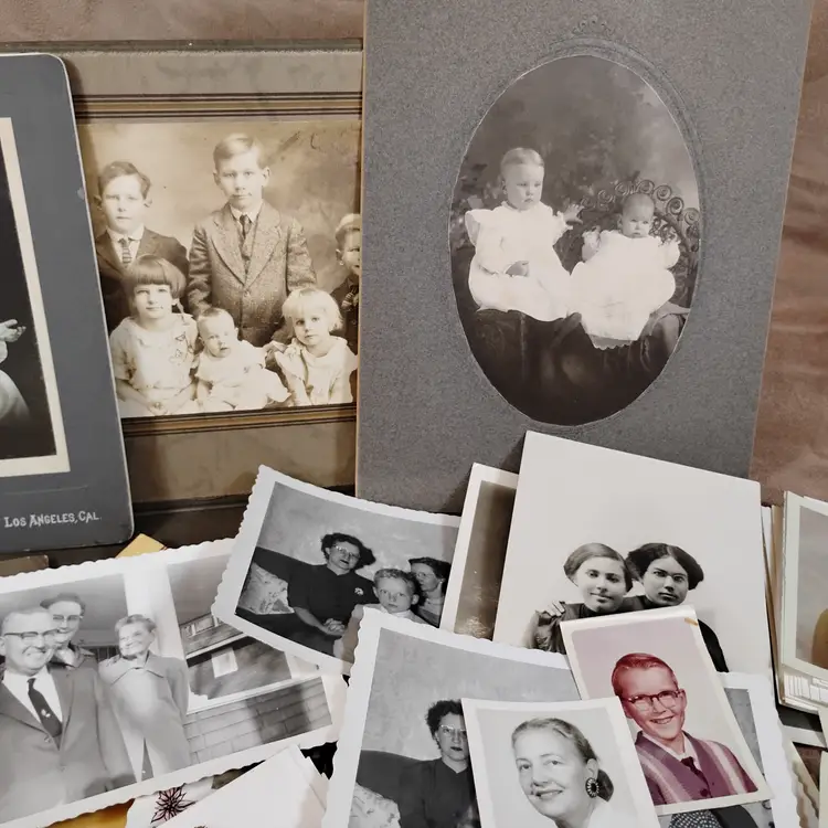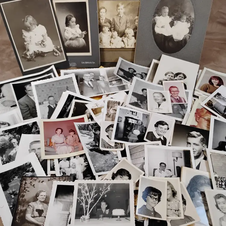 Large assorted lot of vintage and antique family photographs ranging from early cabinet cards to mid-century black and white prints and a few color shots. Includes portraits, group photos, and candid moments—perfect for art projects, décor, or photo collectors. Various sizes and conditions with the authentic wear you’d expect from decades of storage, all sold together as pictured.