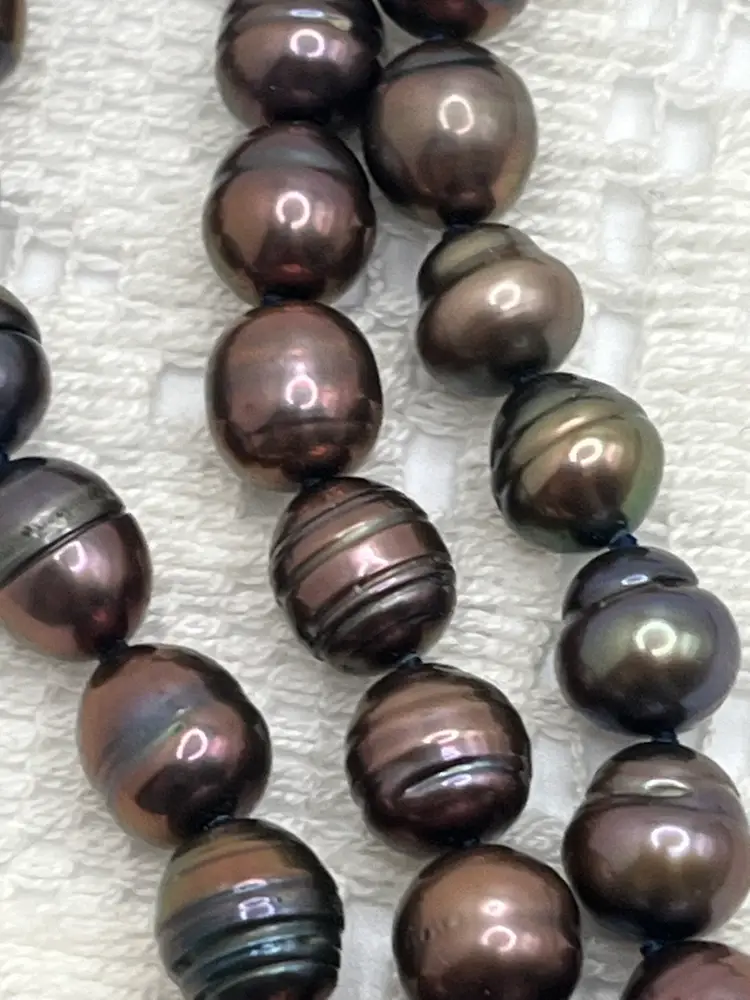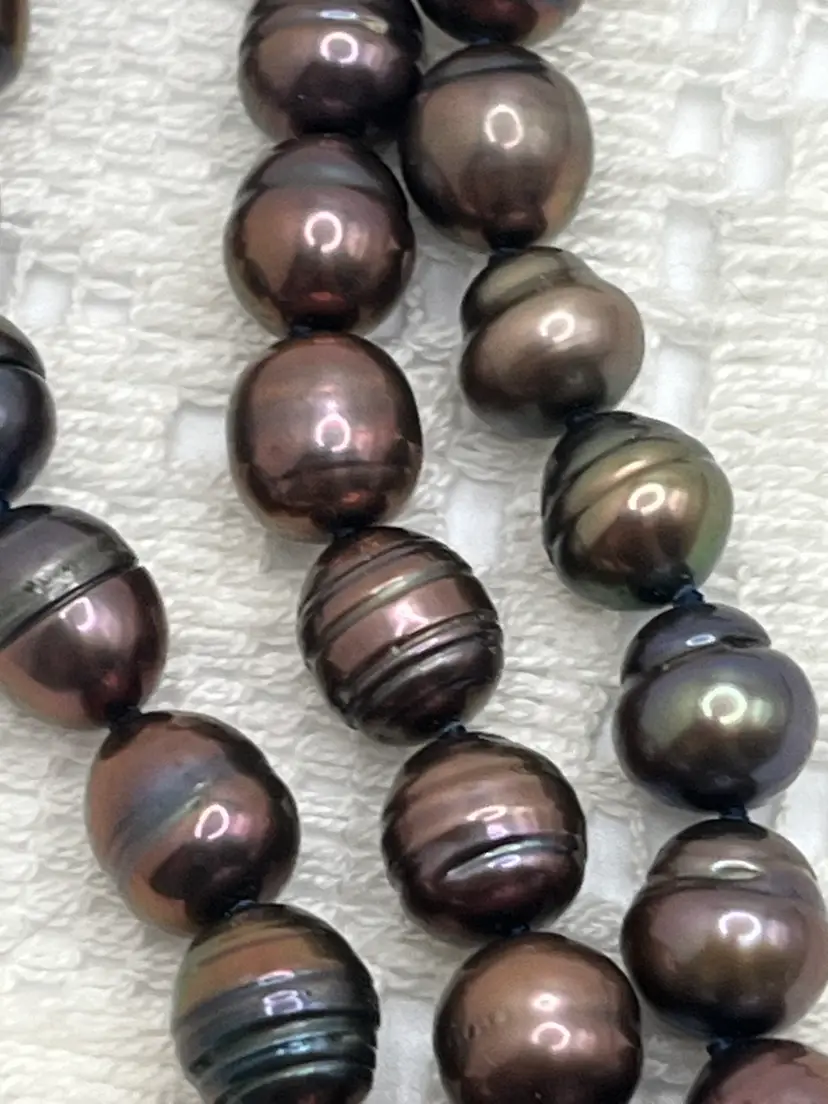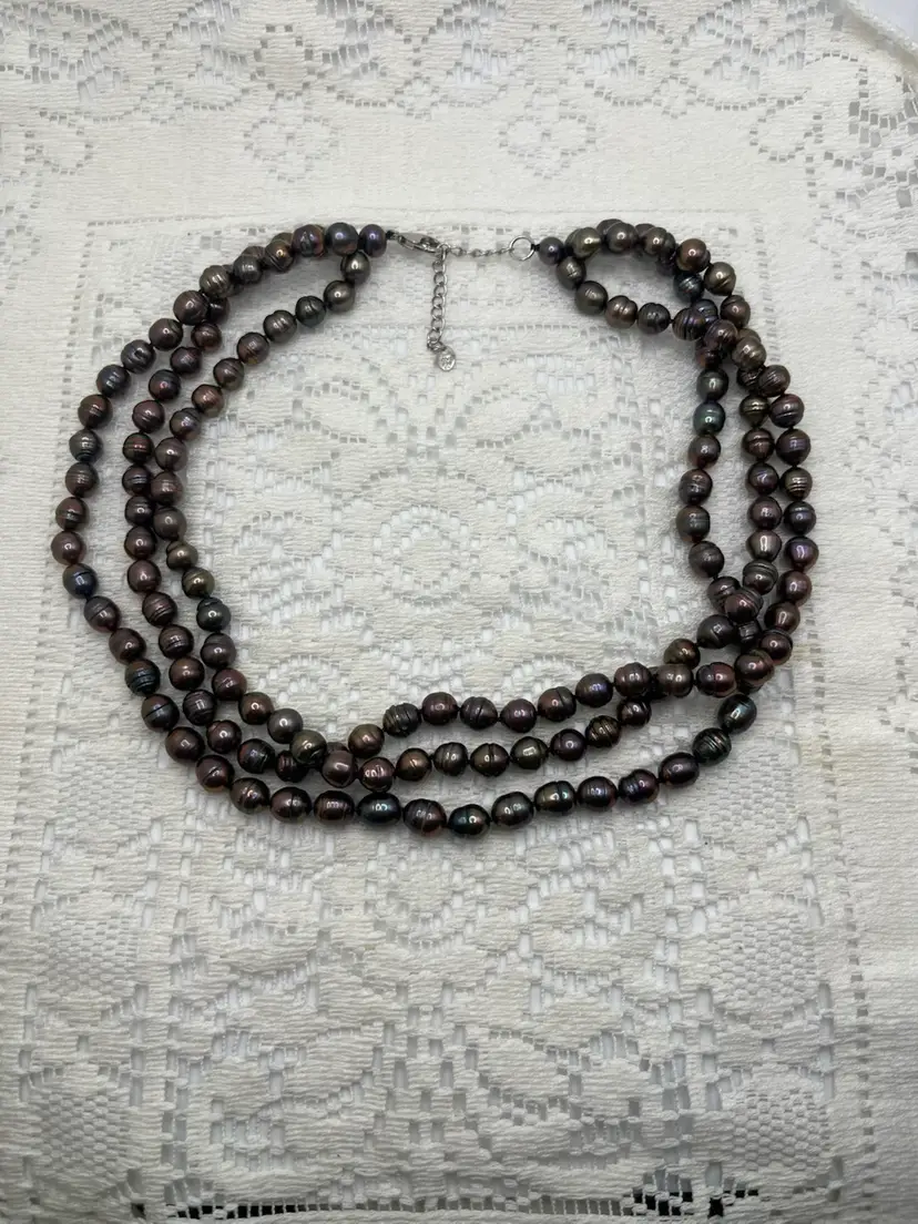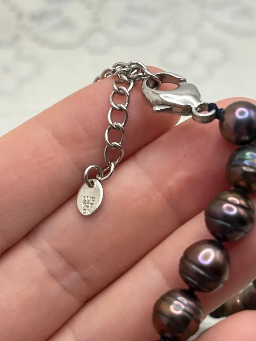This is a beautiful multi-strand black pearl necklace from my grandmother’s jewelry collection. The tag on the extender reads LUC 925 ON, indicating it was manufactured by Lucoral Co., Inc., a company known for producing jewelry, including pieces for designer Lucas LaMeth, who sold his designs on the Home Shopping Network (HSN).