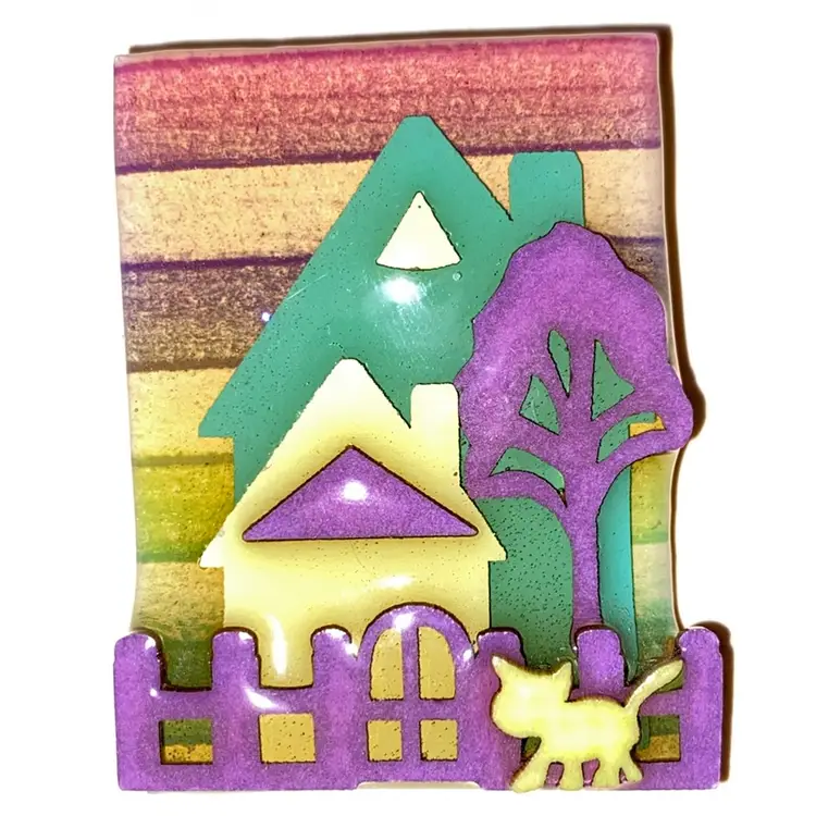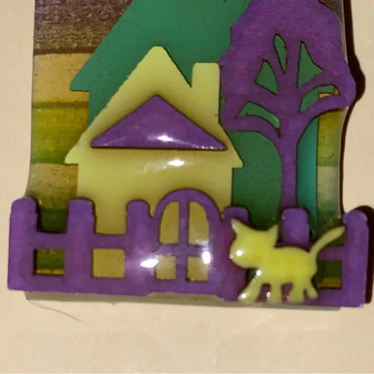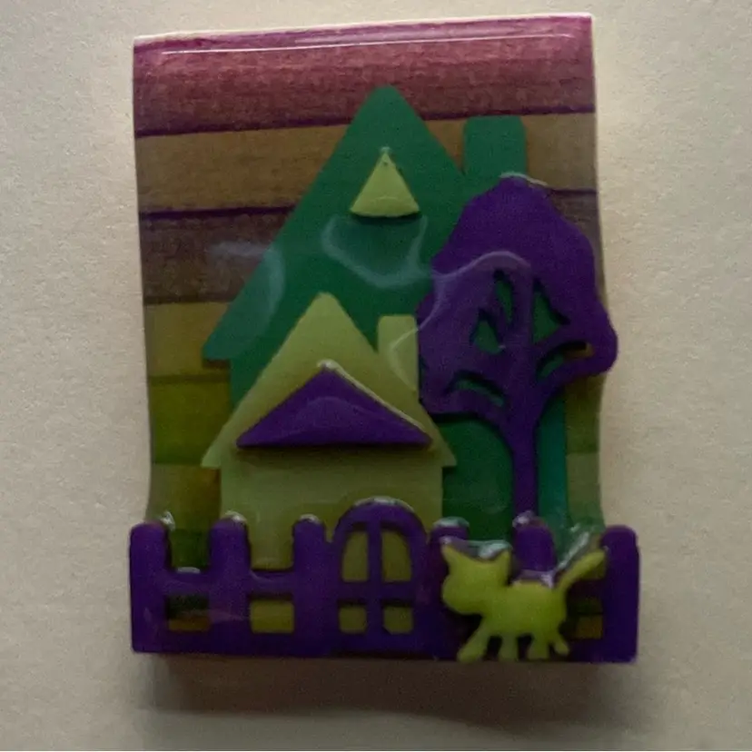 Very detailed and dimensional. Pin is in excellent vintage condition. Has ‘House Pins by Lucinda’ sticker on the back. Colors show best in picture #2 but it’s dark.