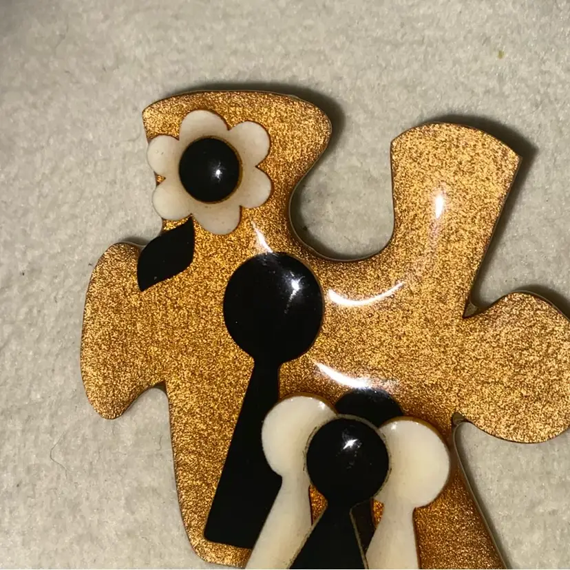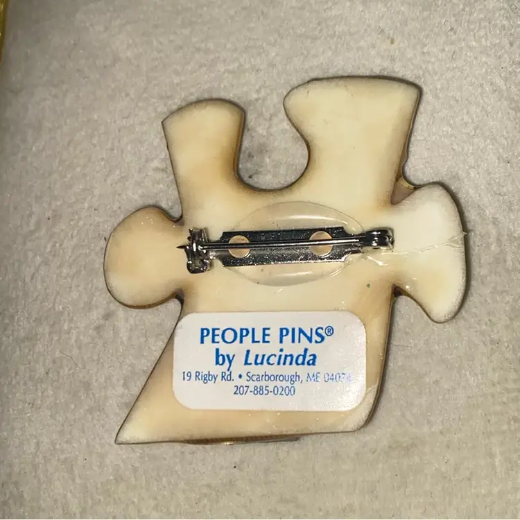 Very dimensional. Pin is in EXCELLENT vintage condition. Lucinda’s puzzle pins are said to bring awareness to autism. Has “People Pins by Lucinda” sticker on the back. After her success with ‘House Pins’, Lucinda went on to create various other types of pins including people, women, book pins, pet pins, and several other pins listed under “Designs by Lucinda”.