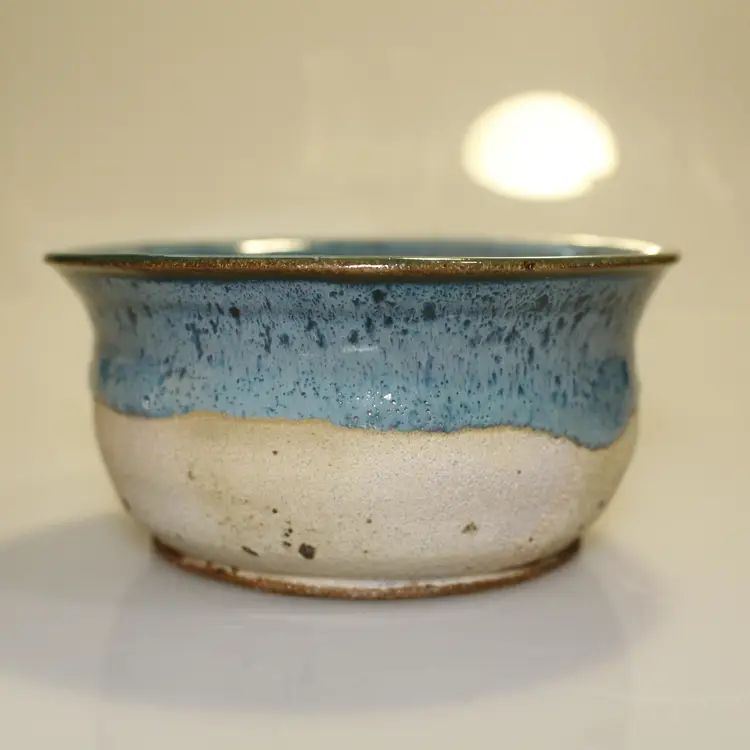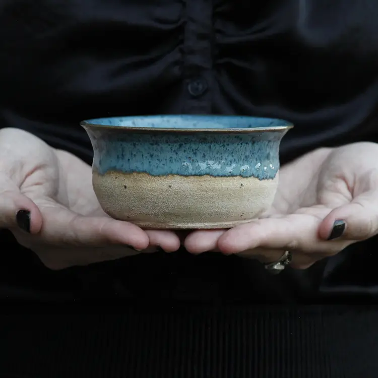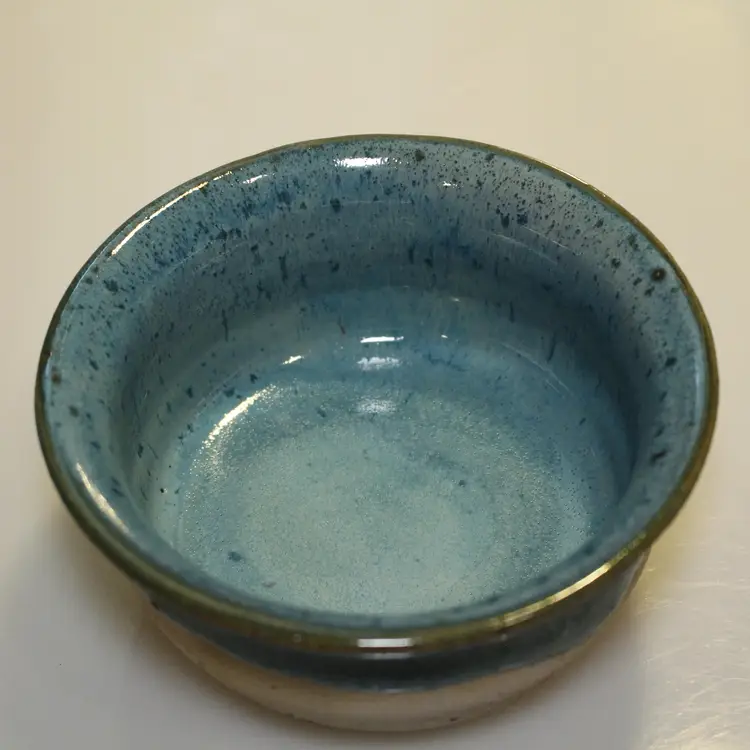This bowl has a flared rim and a vibrant aqua blue glaze. Food safe.