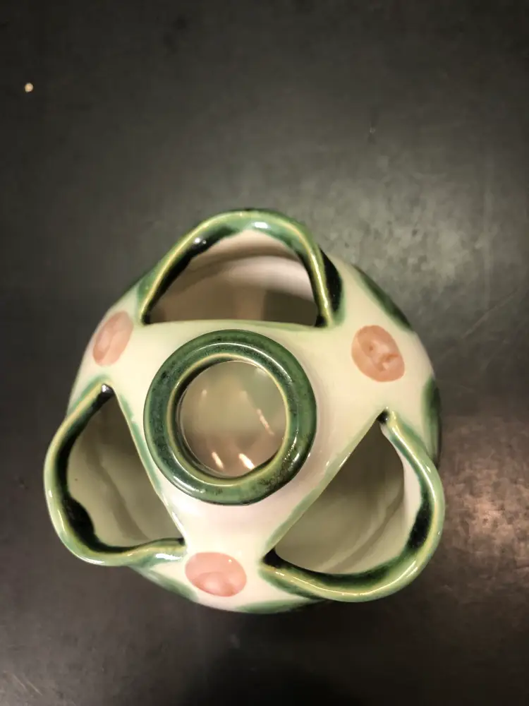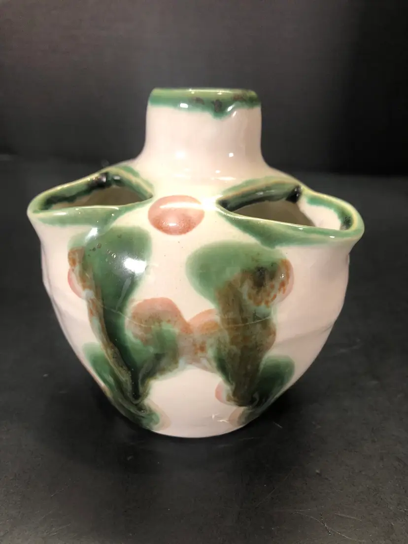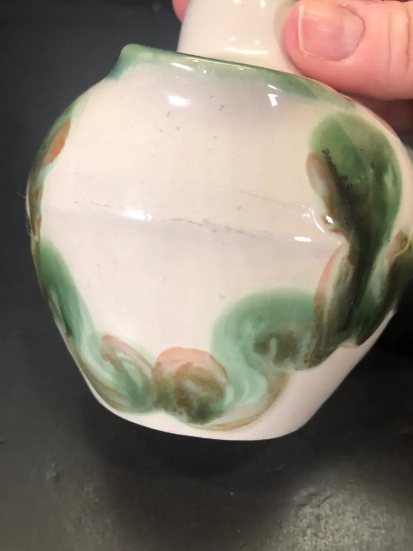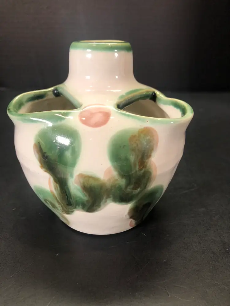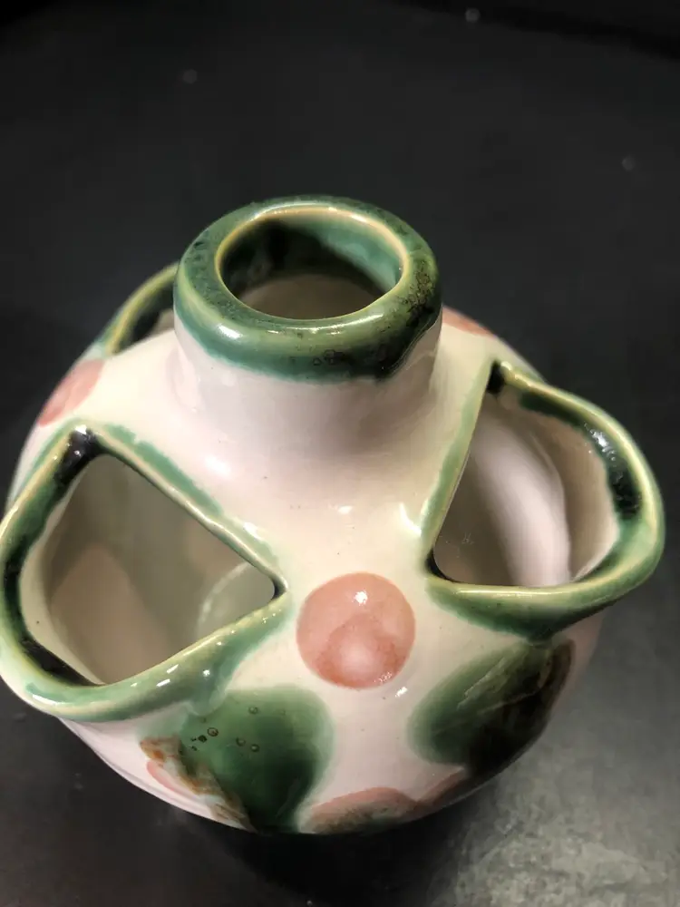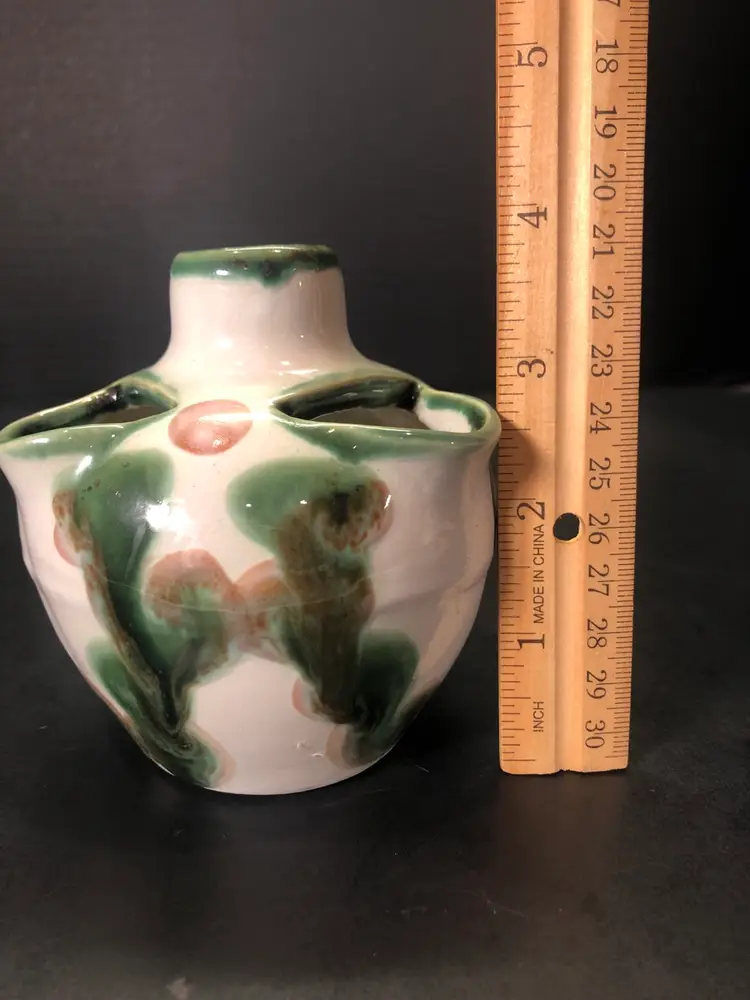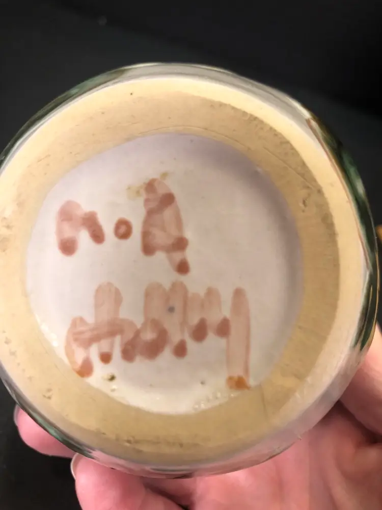 This vase is 4” tall. It is signed. There is a little wear in the paint. See last picture.