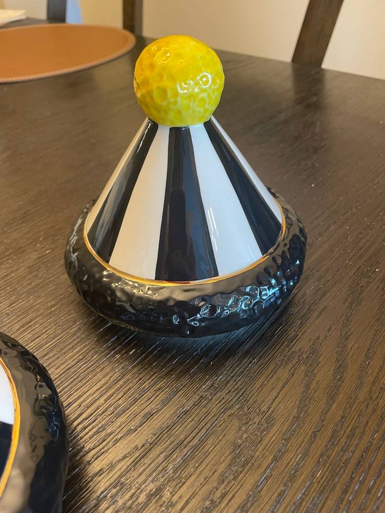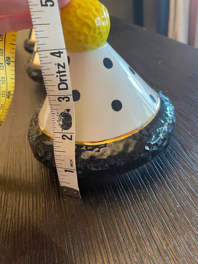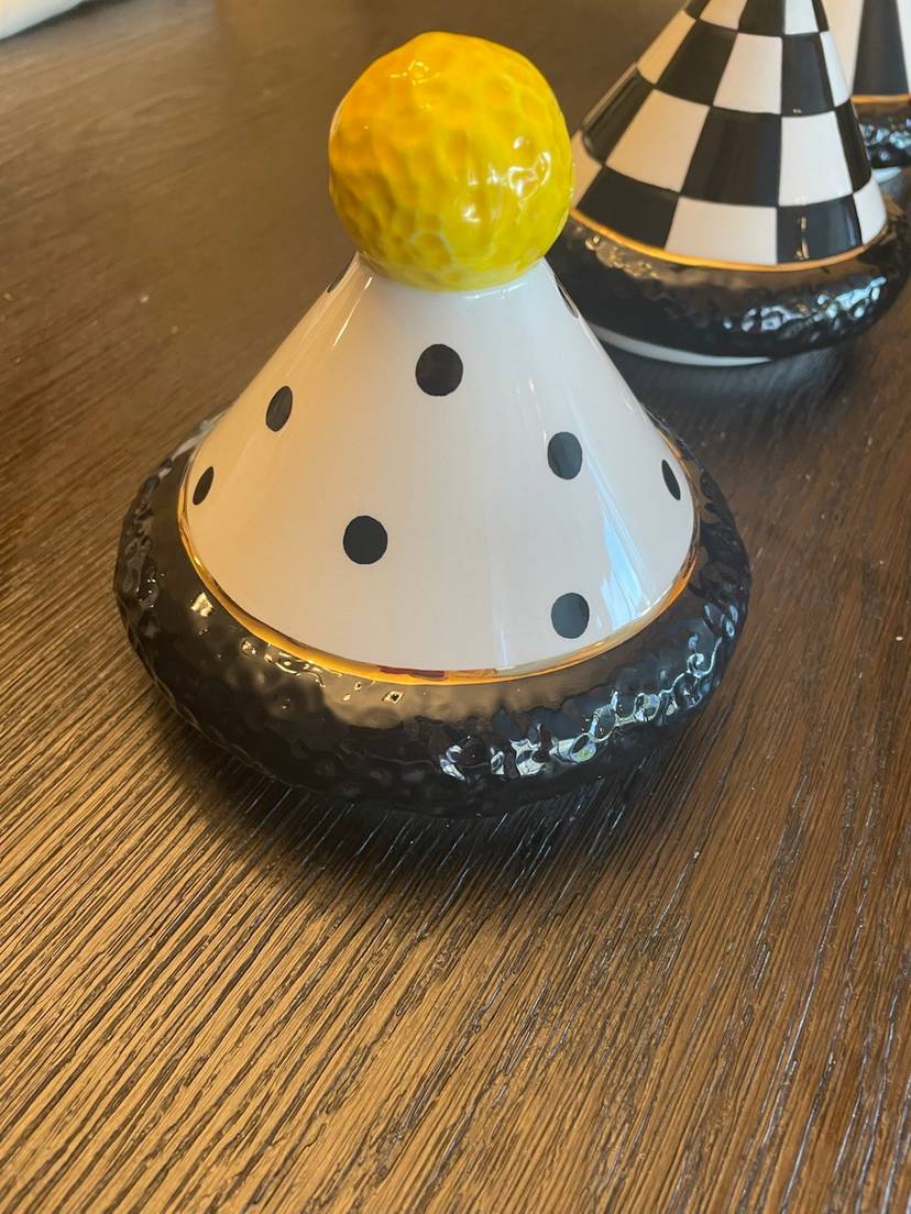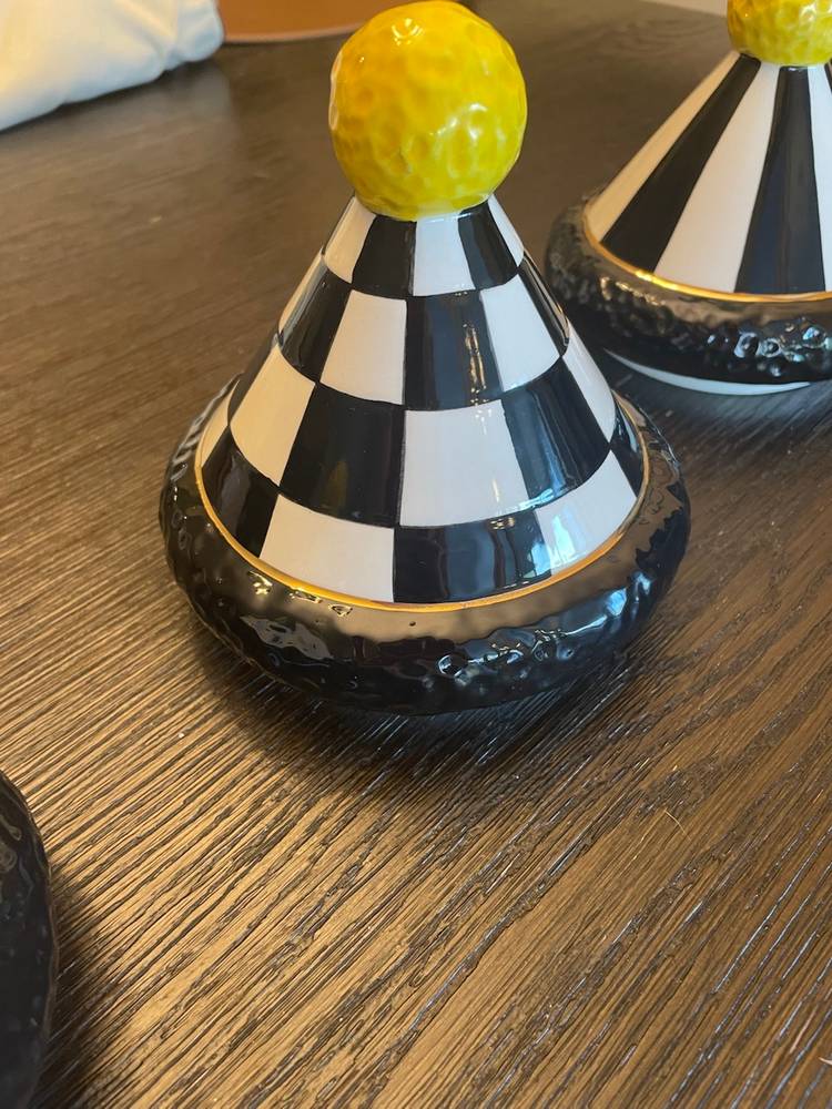 The product is a lot of 3 MacKenzie-Childs hats, each made of mixed materials with a colorful multi-color design. These original hats are crafted in India and made with ceramic materials. The hats feature a unique and stylish design that reflects the brand's signature style, making them a charming addition to any collection or outfit.
