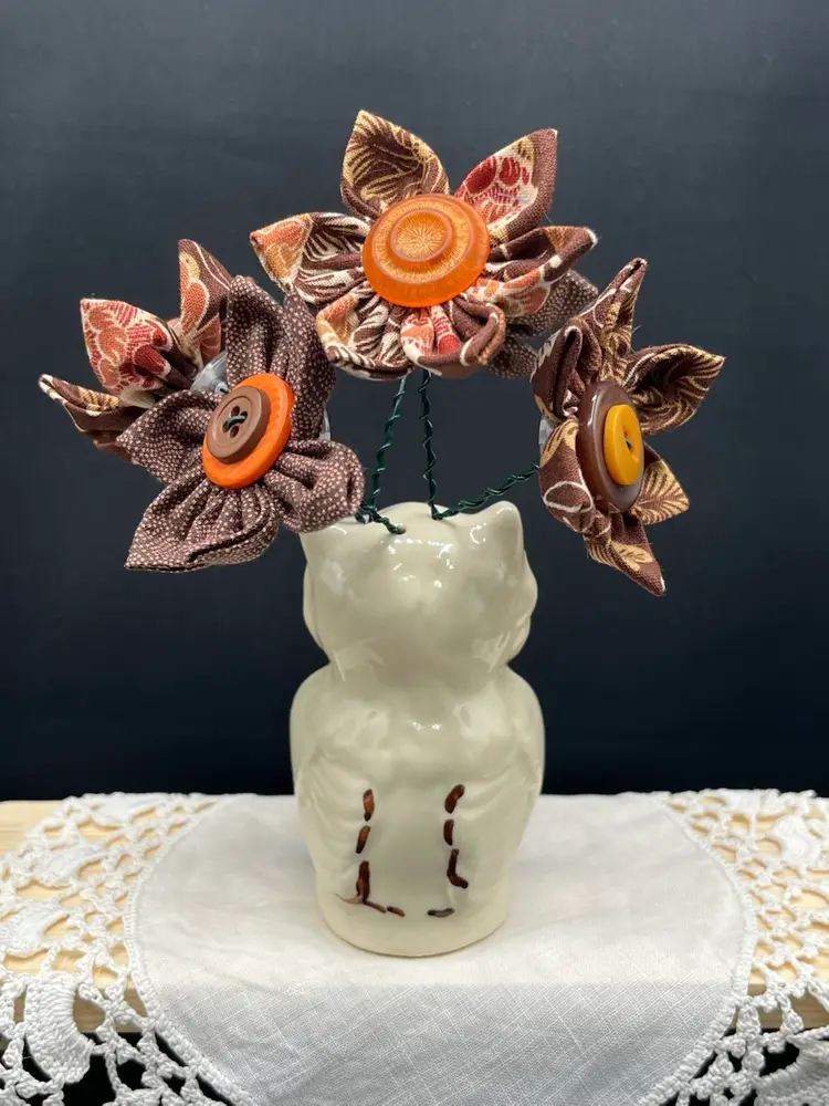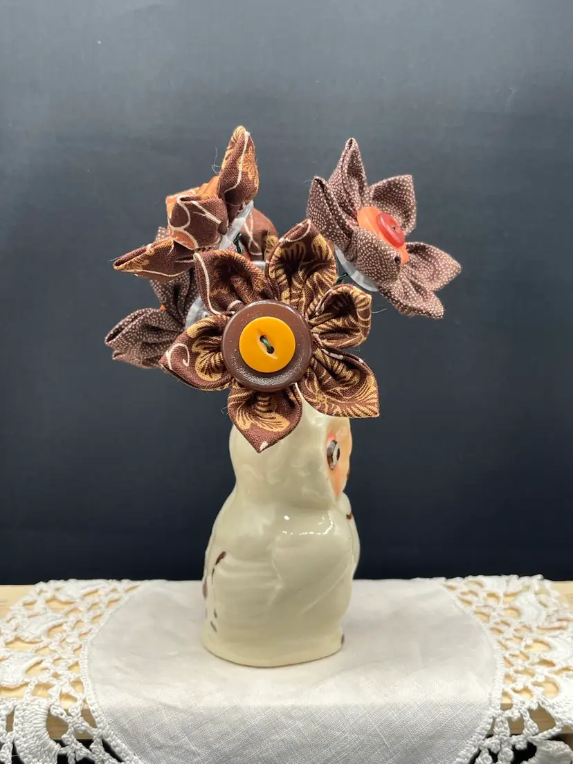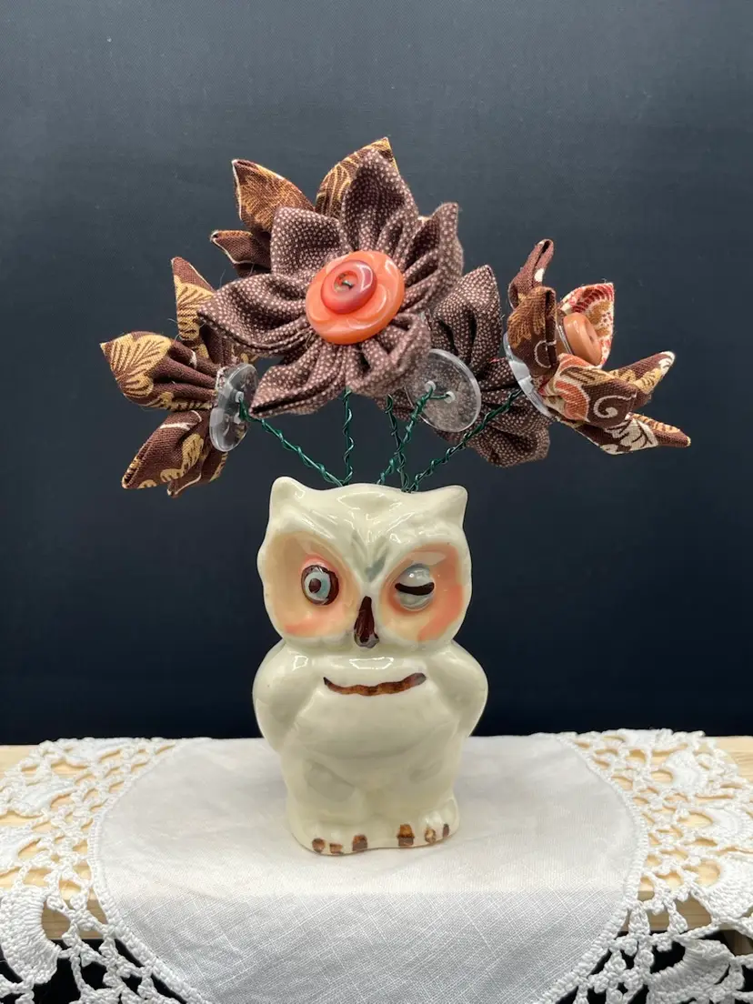 Hand sewn fabric and vintage button flowers arranged in a winking owl shaker. 6.5 x 4”