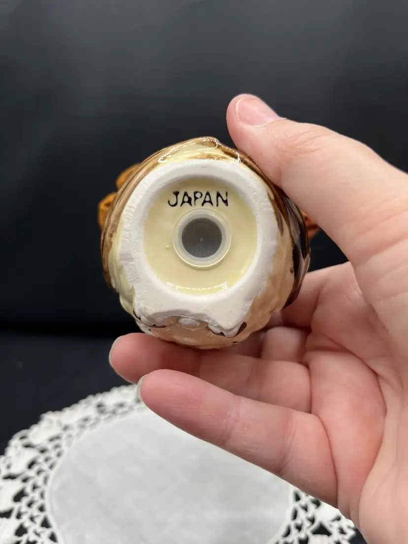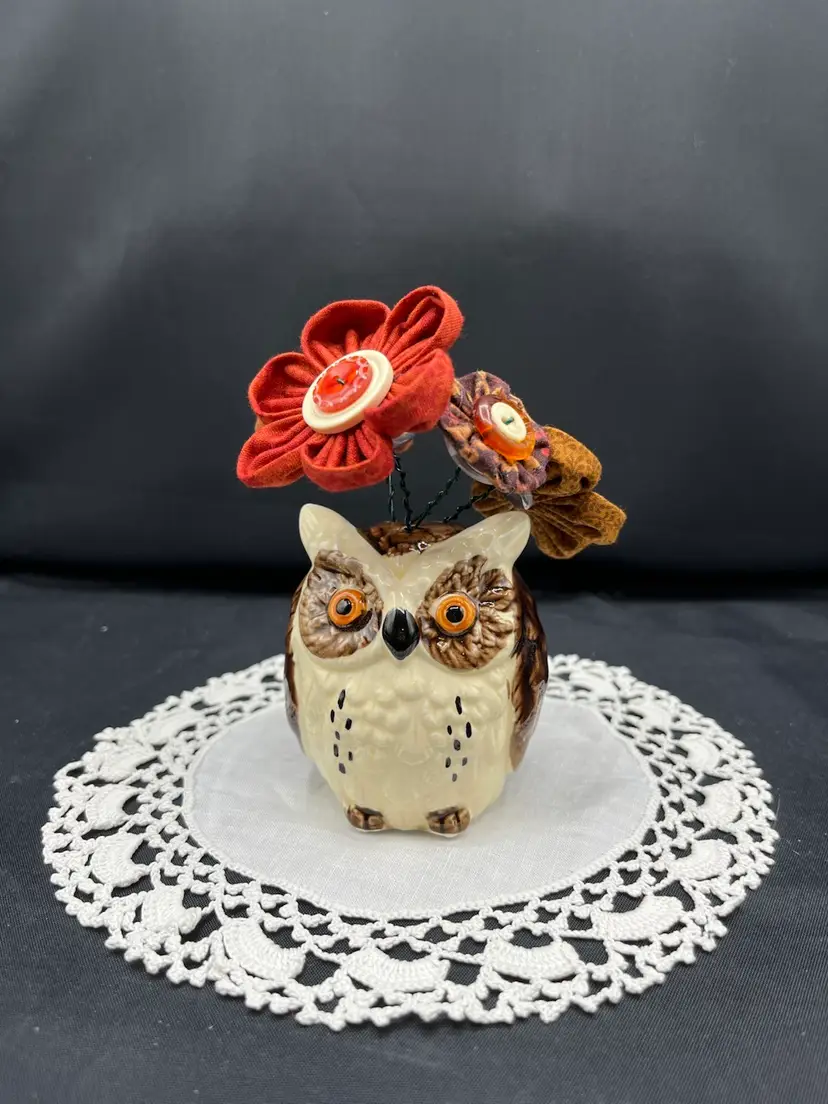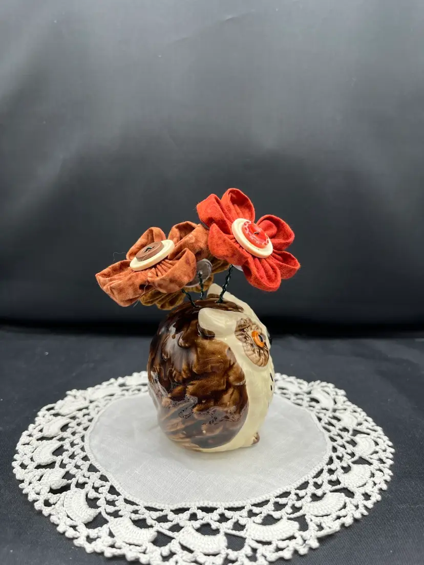 Hand sewn fabric and vintage button flowers arranged in an owl shaker (made in Japan). 5” x 3”