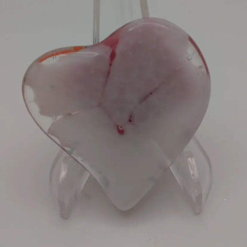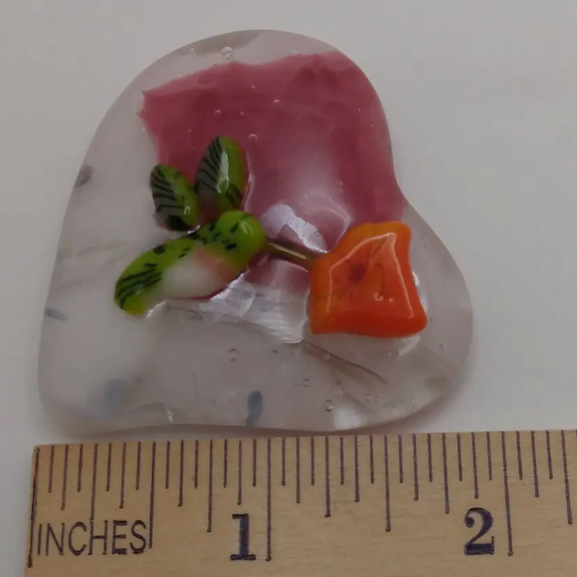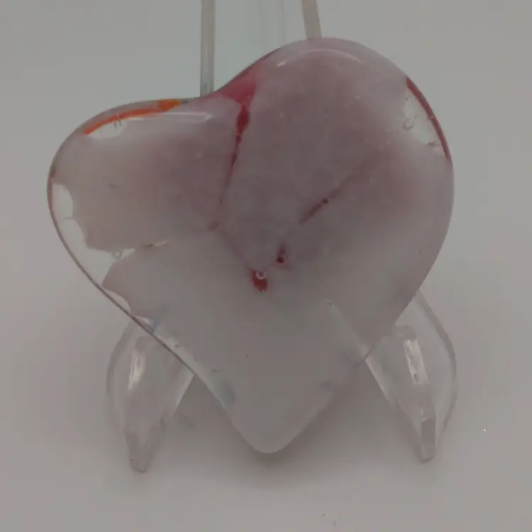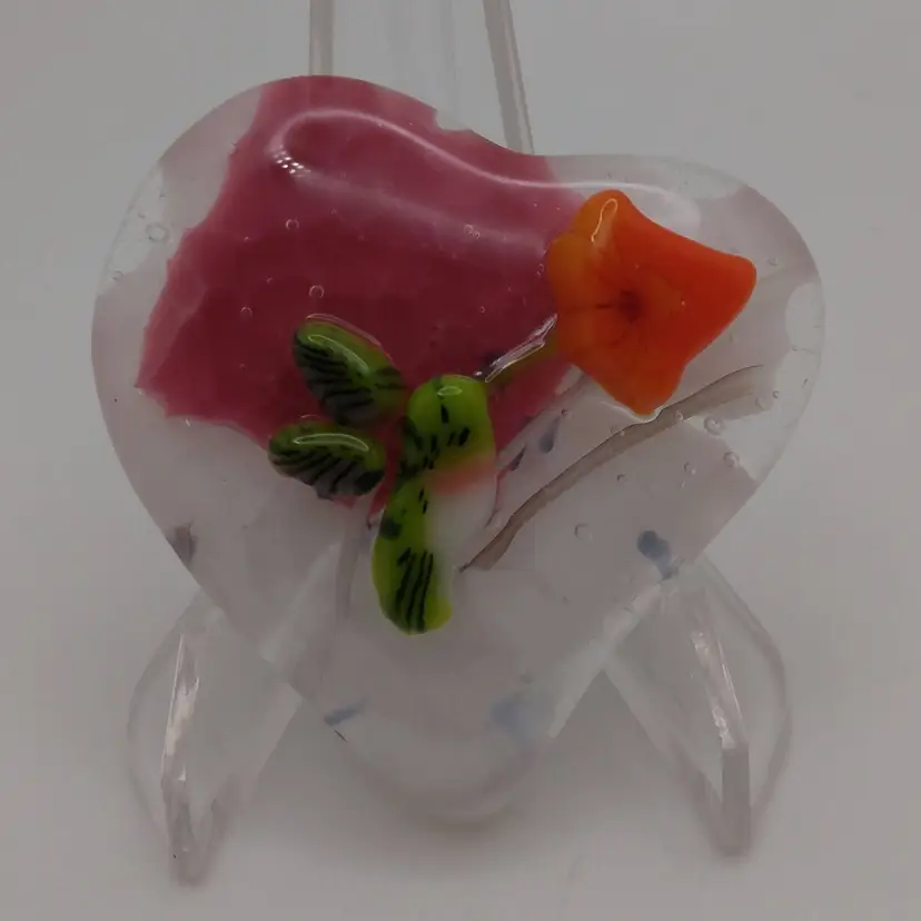 Small, fused glass heart, kiln made with love by me! Each heart is unique and varies in color placement, bubbles and depth of field. Shiny on the front, textured on the back, approximately 2 x 1 3/4-inches; weigh approximately 41 & 42 grams. Made with Bullseye glass base and a fused glass hummingbird and flower from Tabitha's Glass Emporium. Price is for ONE heart.