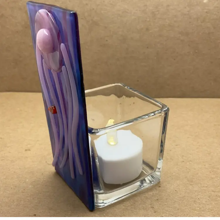 Tea Light, kiln made with love by me! Unique and varies in color placement, bubbles and depth of field. Shiny on the front, textured on the back, glass approximately 4" x 2-inches. Made with Bullseye glass and elements from a variety of other glass artists. Battery tea light included. New base.