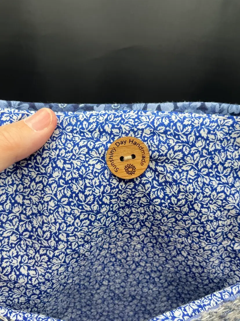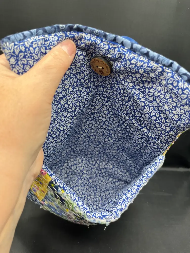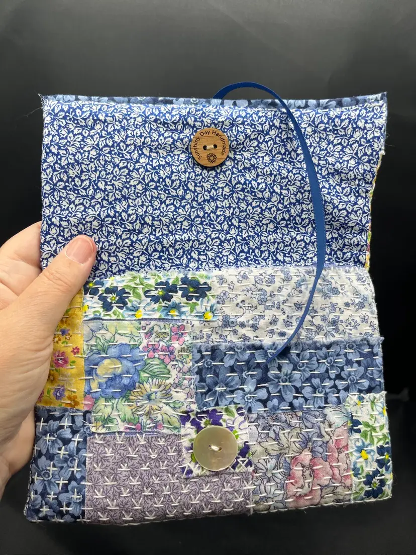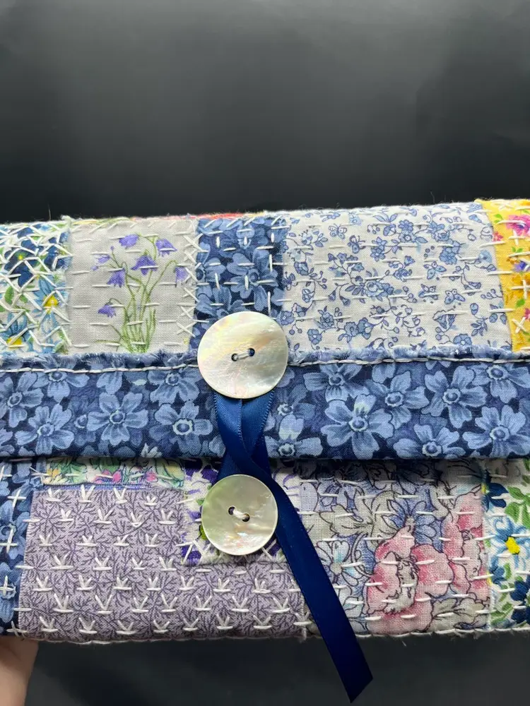 Hand sewn with a variety of cotton fabric scraps, lined with mother of pearl buttons and ribbon wrap closure. 7 3/4” x 5 1/2”