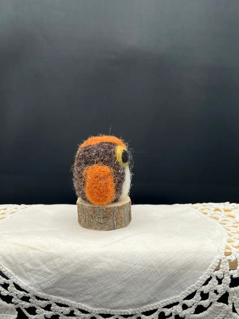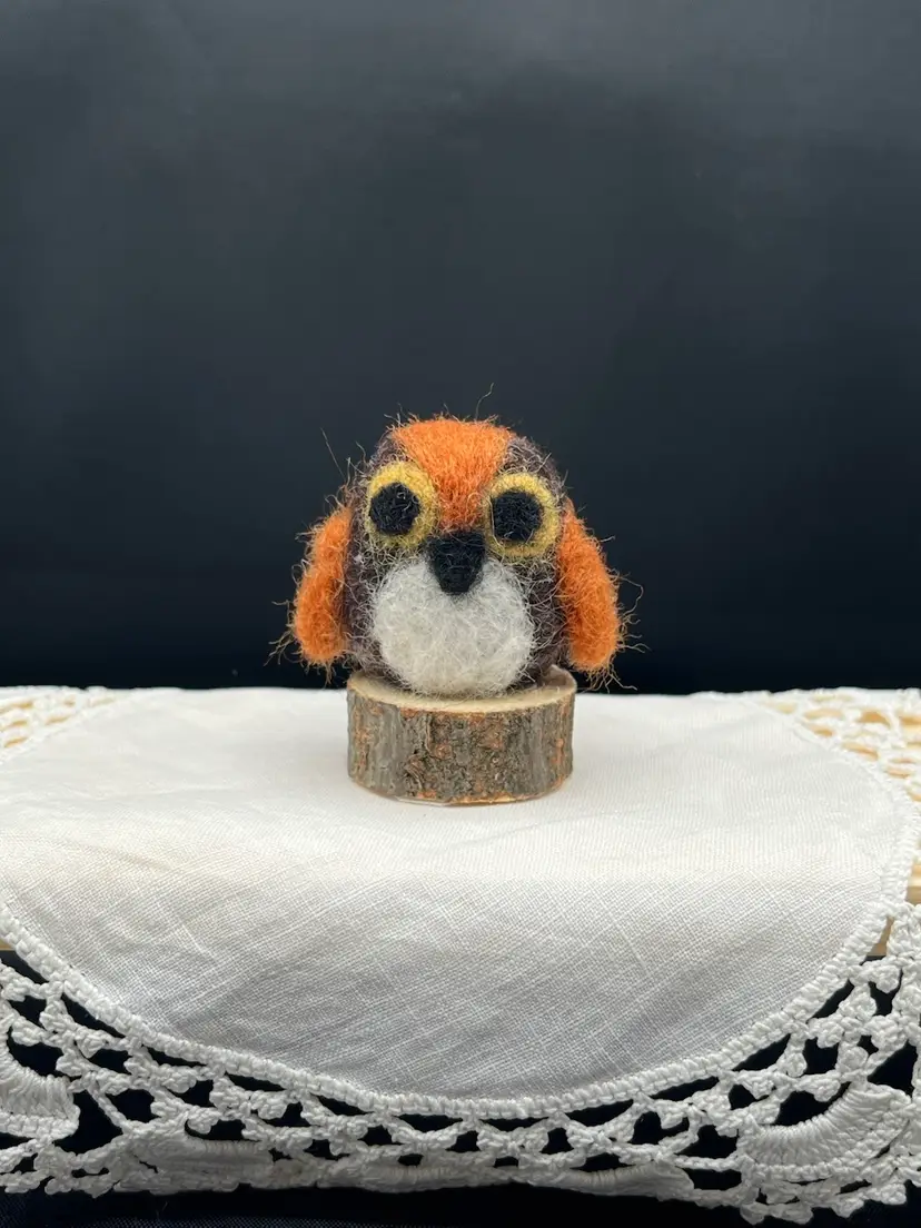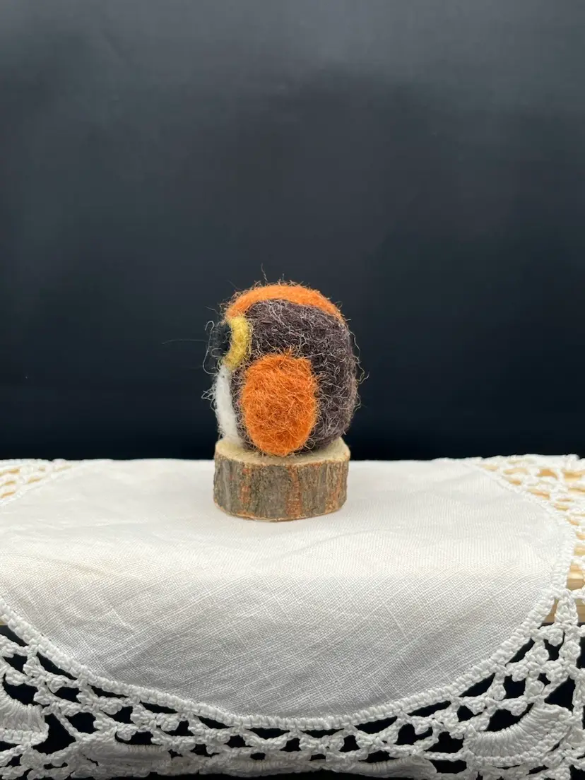 Hand needle felted little brown owl mounted on a wood slice. 2” x 1.75”