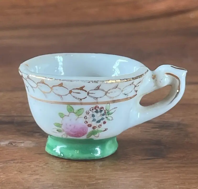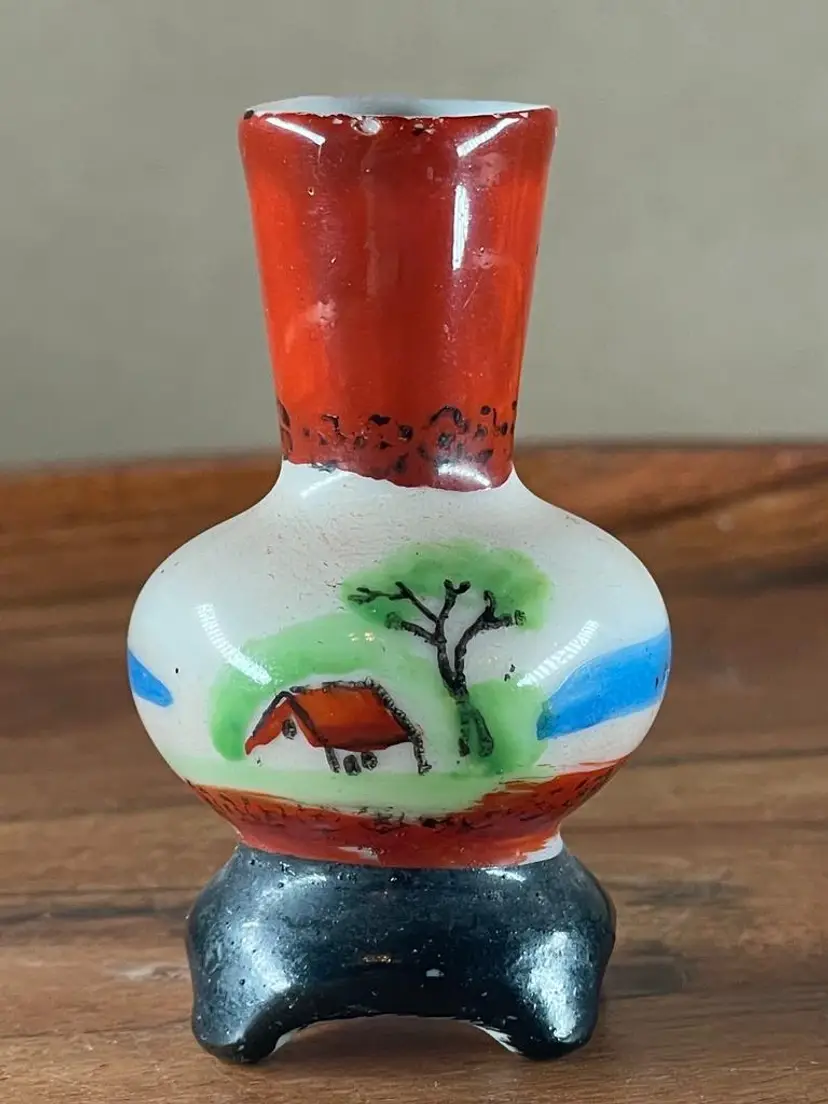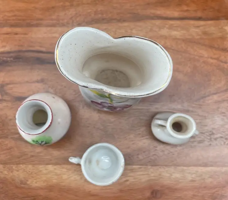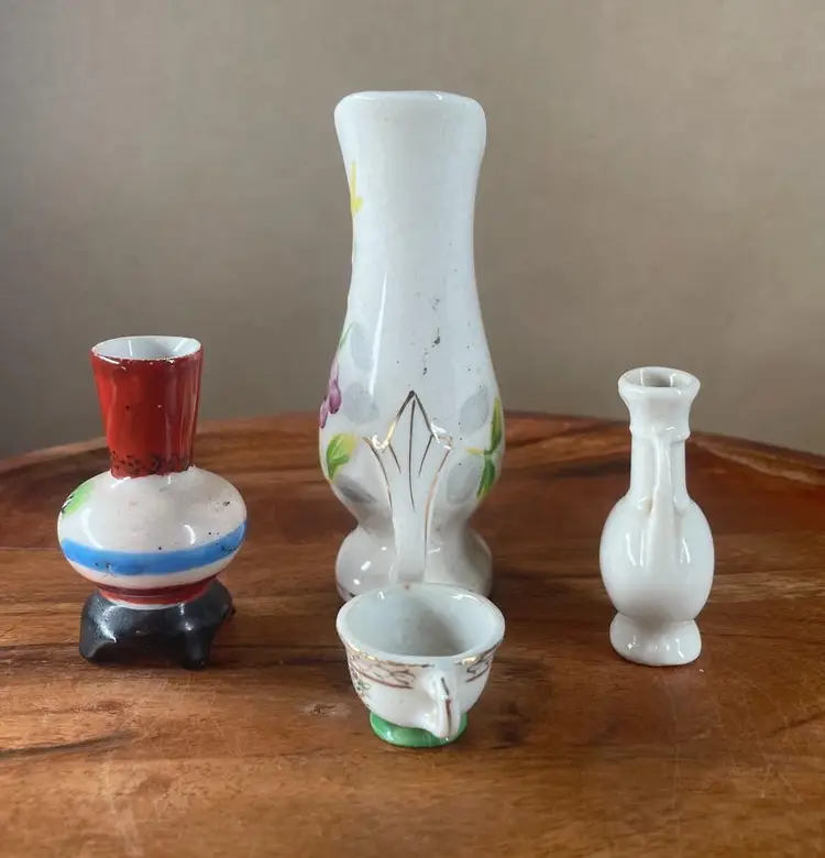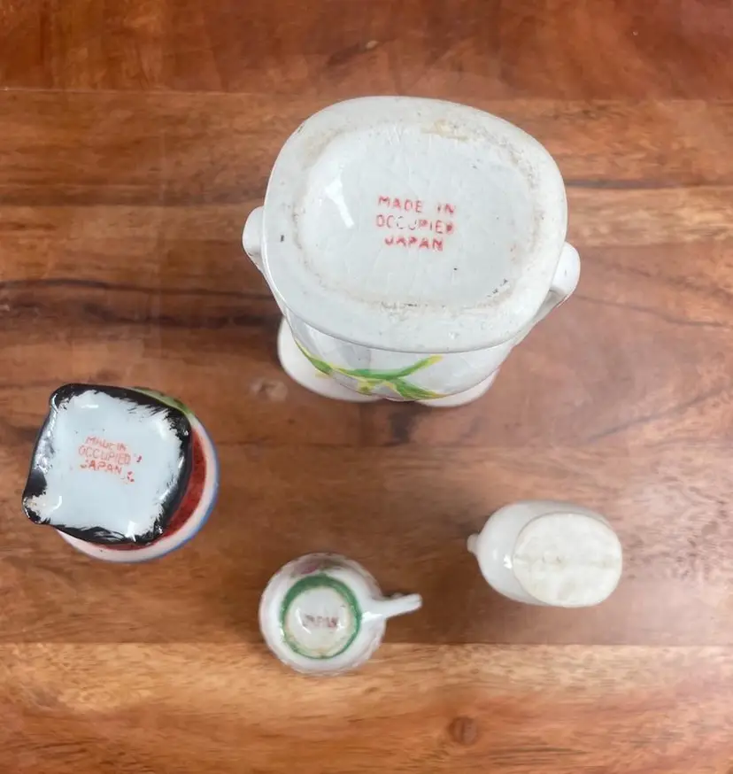 Miniature Vases Height Ranges from 4"H to 2"H. Miniature Tea Cup 1"H. The tallest vase shows crazing. Plain 2 handled vase does NOT show "Made in Occupied Japan".