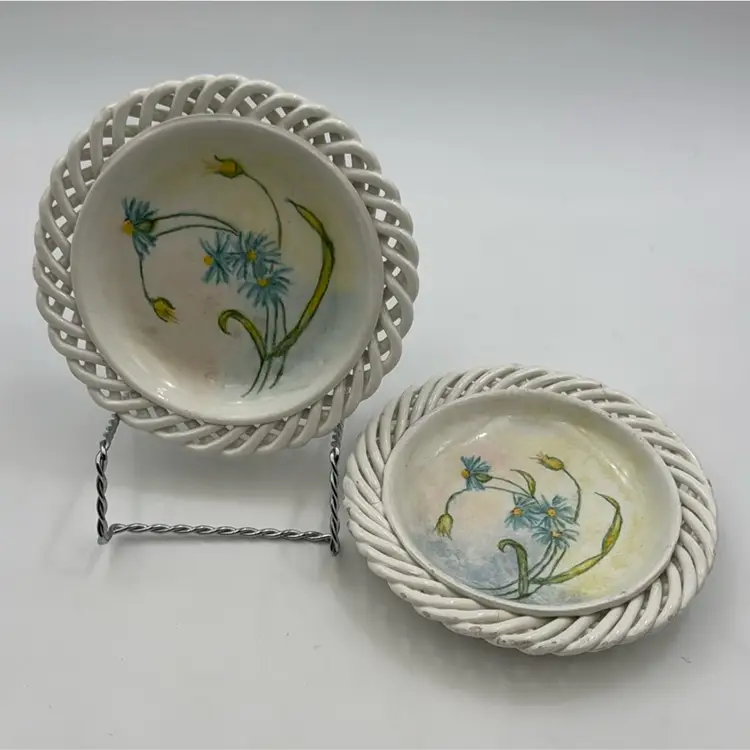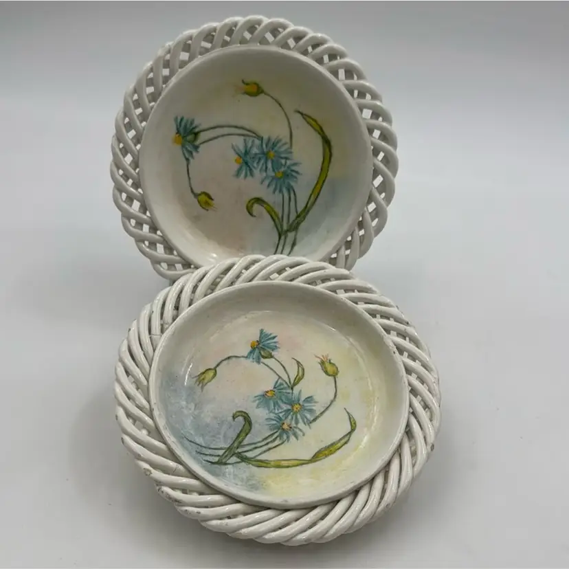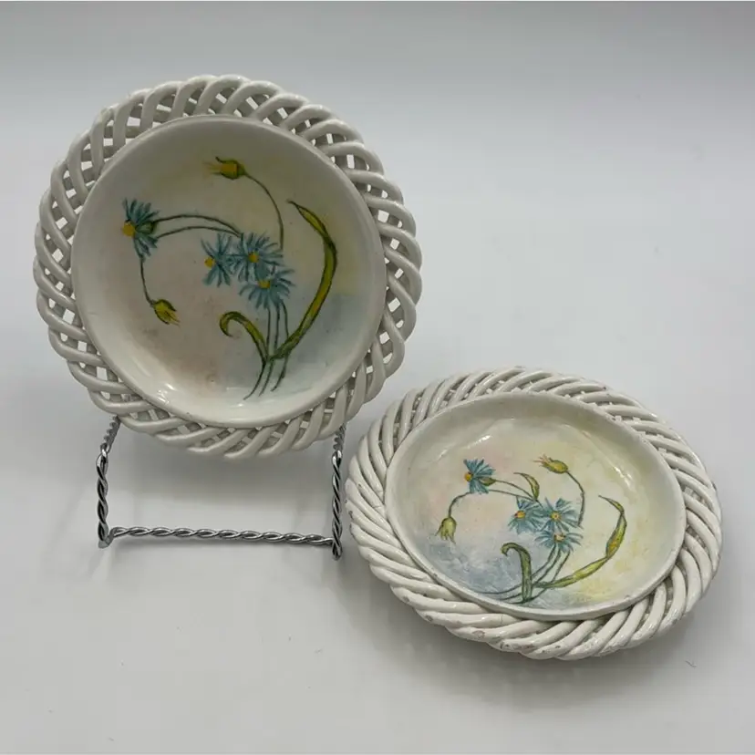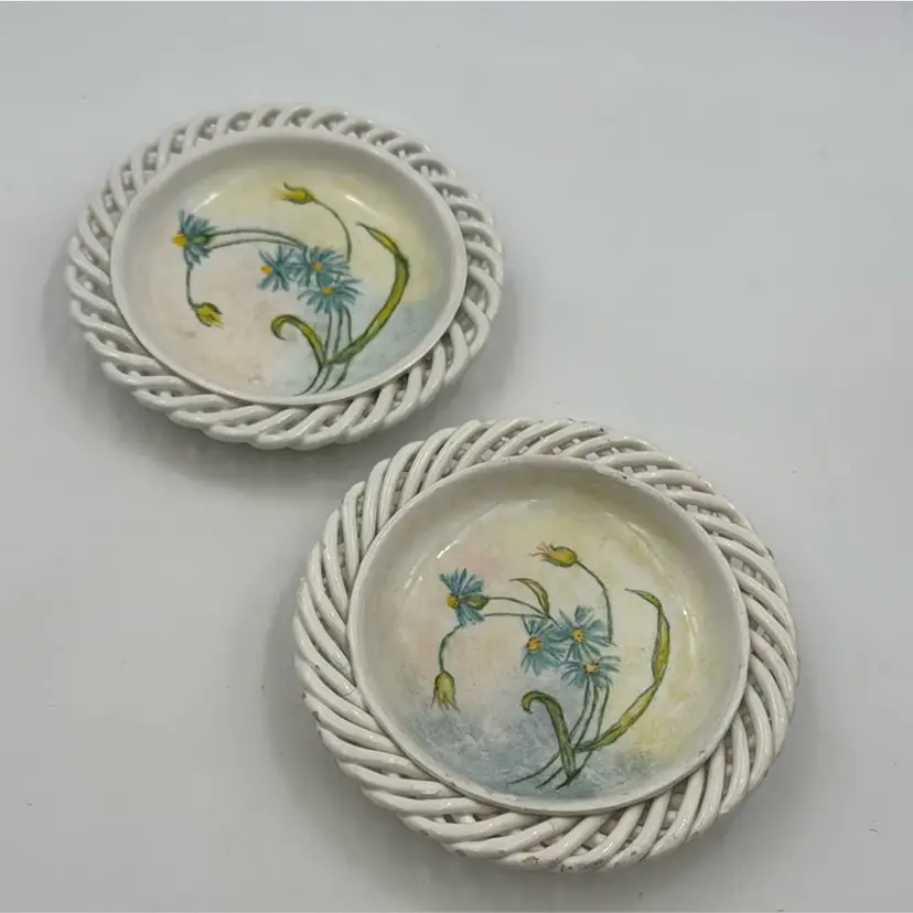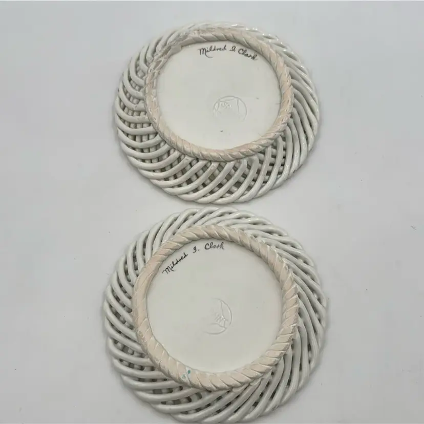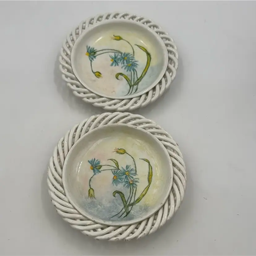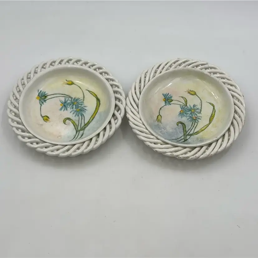 53/4”Round in vintage condition does not take away from the cuteness has some plate ware on one the other one has one plate ware spot.