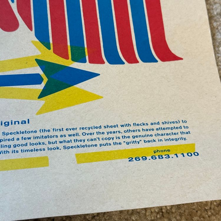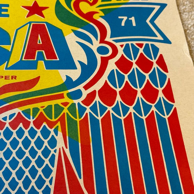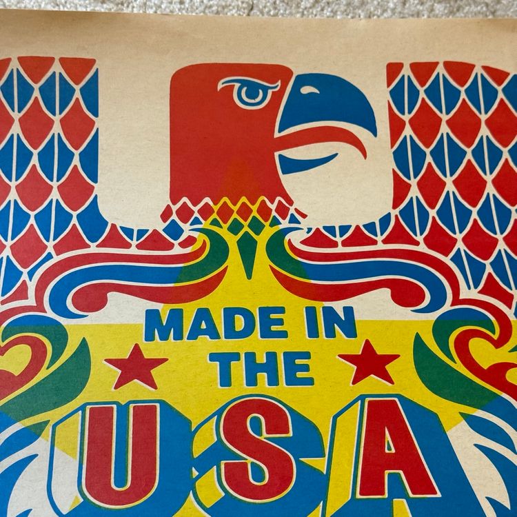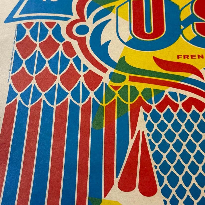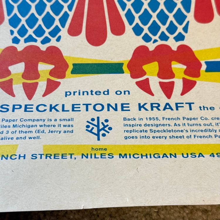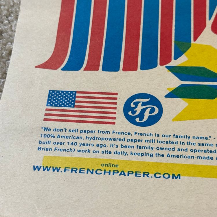 The Speckletone Kraft "Made in the USA" eagle poster was offered as a giveaway in May 2020 to celebrate nearly 150 years of the French Paper Company's operation in the United States. The company was founded in 1871 and released its Speckletone paper line in 1955. The poster was designed by Charles S. Anderson Design, a company that has had a long-running partnership with French Paper Company since 1989.