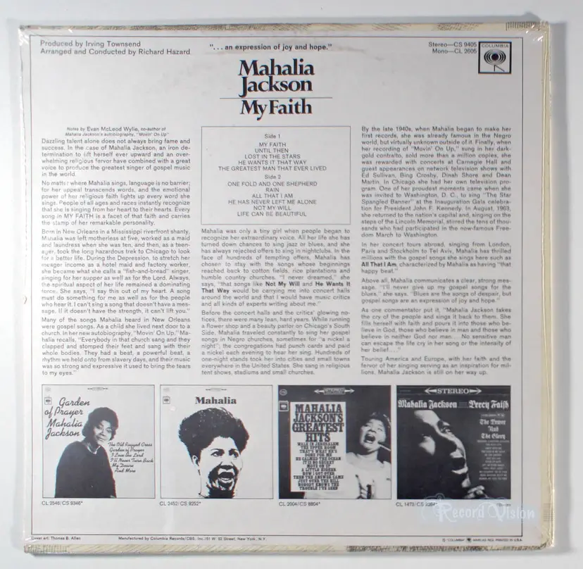 My Faith, by Mahalia Jackson, released in 1967 by Mahalia Jackson on Columbia Records, is a gospel album featuring 11 tracks that showcase her powerful contralto voice and deep spiritual conviction. The album includes traditional hymns and spirituals, reflecting Jackson's lifelong dedication to gospel music and her refusal to perform secular genres like blues or jazz. While My Faith is not as prominently celebrated as some of her earlier works, it contributes to her legacy as the "Queen of Gospel," a title earned through her transformative influence on the genre and her role in the civil rights movement. No specific singles from My Faith are noted as chart-topping hits in the provided sources, unlike her earlier breakthrough single Move On Up a Little Higher, which sold two million copies in 1947. The album remains a testament to Jackson's ability to evoke profound emotional and spiritual responses, as noted by critics who praised her ability to connect with diverse audiences.