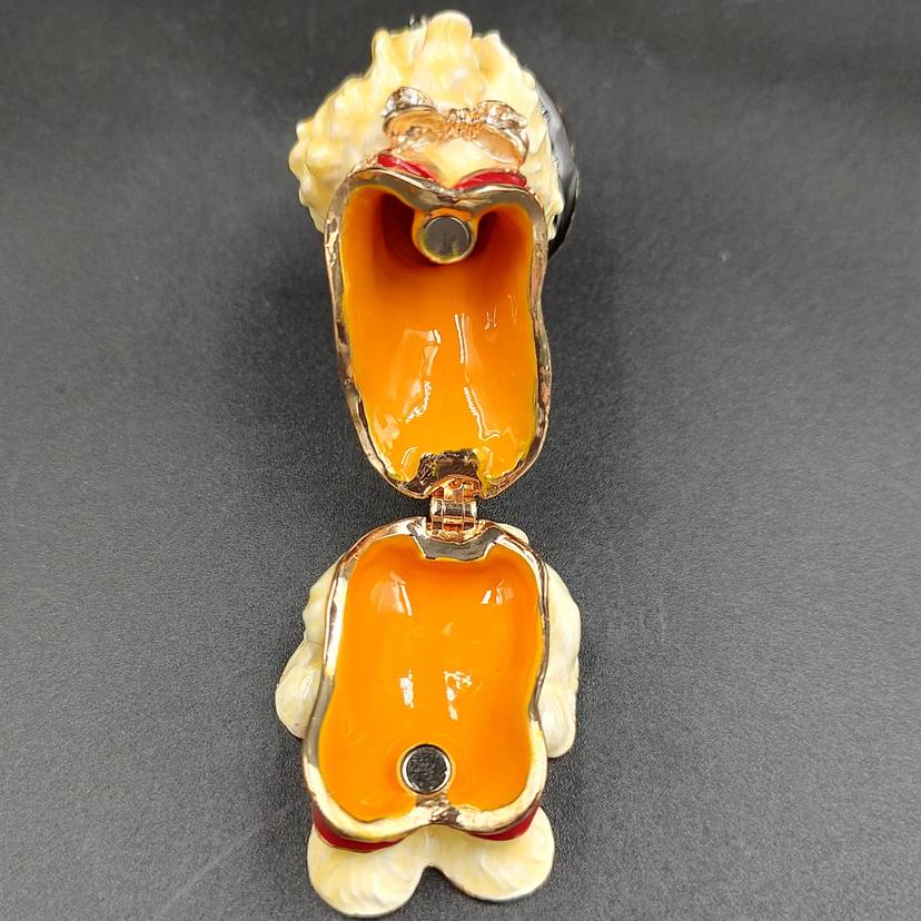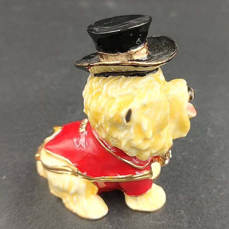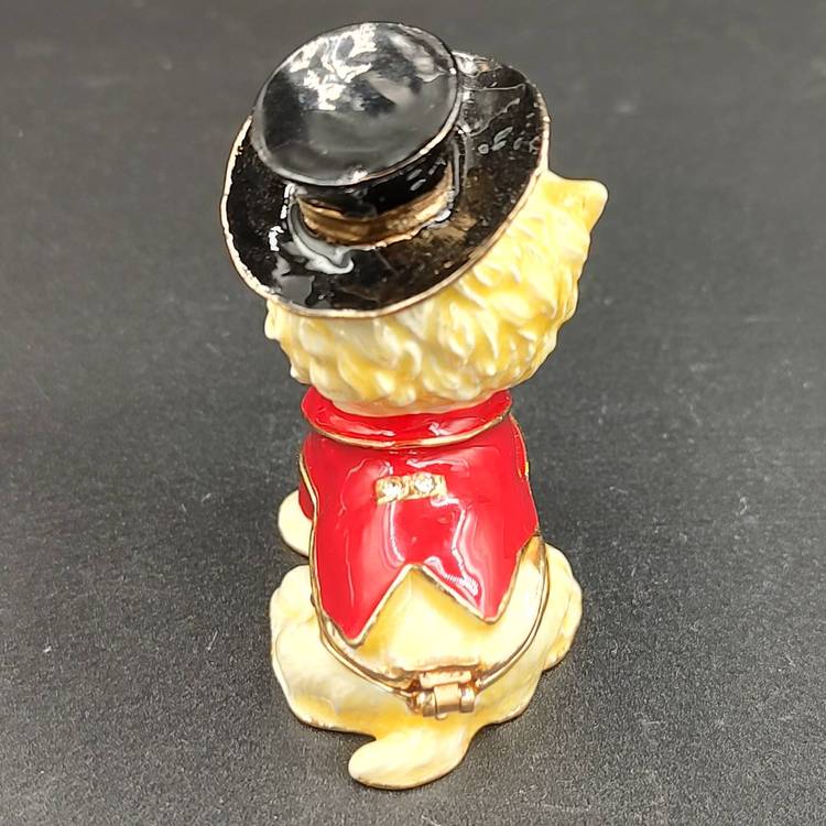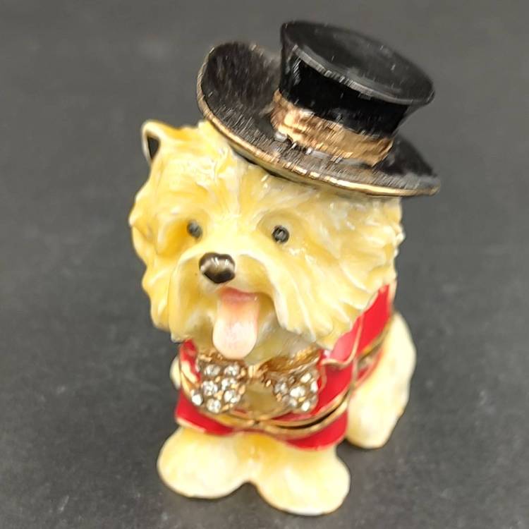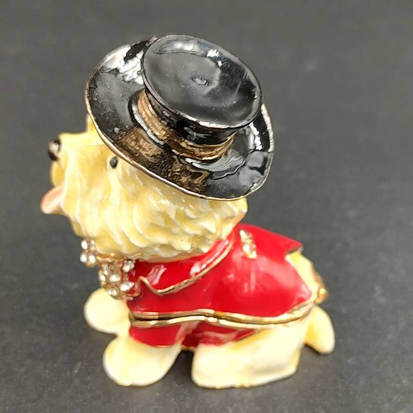 Maltese Dog With Tux And Top Hat Enameled Trinket Box. Comes with box. Height 2" x width 1 4/16 x length 2".