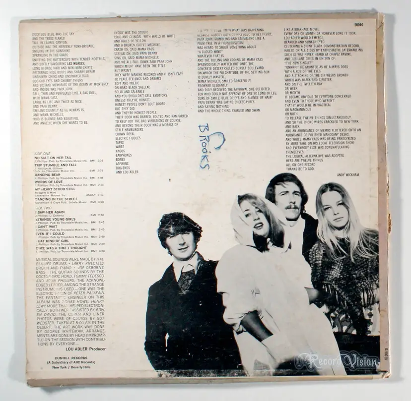 The Mamas & the Papas, by folk rock vocal group of the same name, peaked at No. 4 on the US Billboard 200 album chart and No. 24 in the UK. The lead off single, I Saw Her Again, reached No. 5 on the US Billboard Hot 100 chart and No. 11 in the UK Singles Chart. Words of Love was released as the second single in the US peaking at No. 5. In the UK, it was released as a double A-side with Dancing in the Street (a cover of the 1964 hit by Martha and the Vandellas) and charted at No. 47 in the UK. After it was discovered that group member Michelle Phillips was having an affair with Gene Clark of the Byrds, tension in the band erupted and Phillips was fired from the group on June 4, 1966. In June, a new singer was hired to replace her. Jill Gibson was producer Lou Adler's girlfriend at the time and was already a singer/songwriter who had performed on several Jan and Dean albums. The photo already chosen for the album's cover featured Michelle Phillips prominently, so Dunhill had Gibson take a photo posed in exactly the same position as Michelle, and then superimposed the new photo over that of Phillips. However, the decision was then made to shoot an entirely new picture with the new line-up, and to also change the album's title to Crashon Screamon All Fall Down. Several thousand advance pressings of the album with this cover and title were sent out to radio stations and record distributors, but with the return of Michelle to the group just prior to the LP's general release, the original cover and eponymous title were quickly reinstated. Copies of the rare Crashon pressings are now highly sought after collectors items.