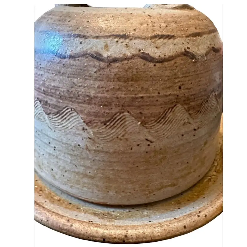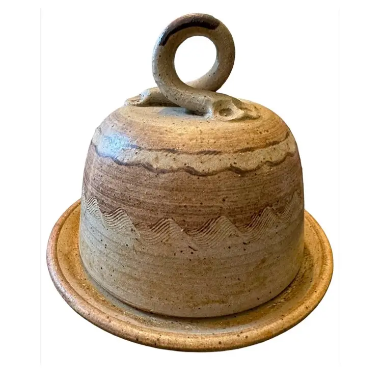 Beautifully done studio art pottery cheese dome with applied handles and a nice wave pattern by Minnesota potter Martha Cutkomp (1917-2010).