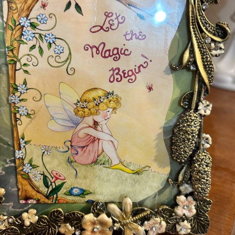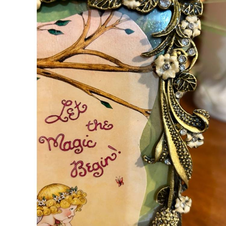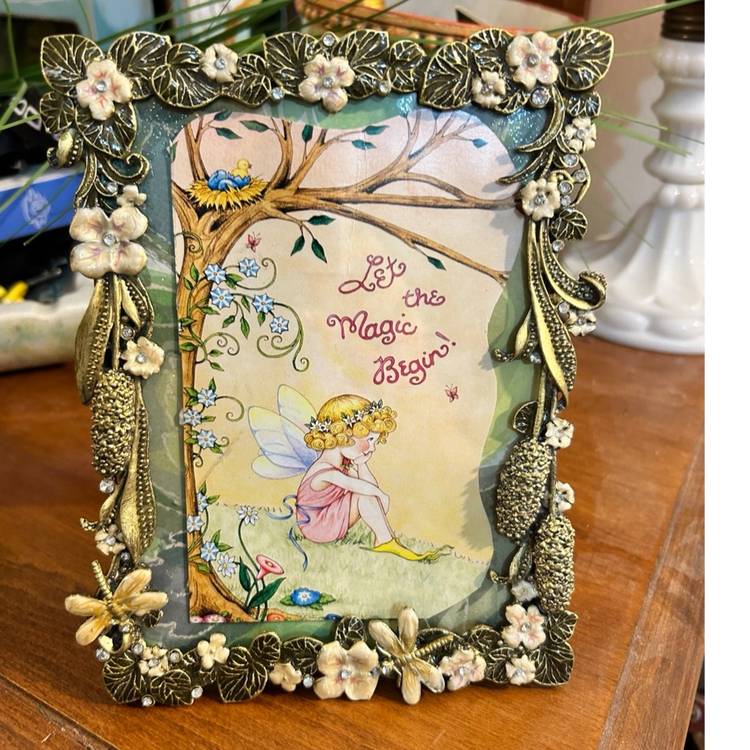 5x7" frame. Adorable face and beautiful colors on this card. Frame is metal with enamel peachy flowers .