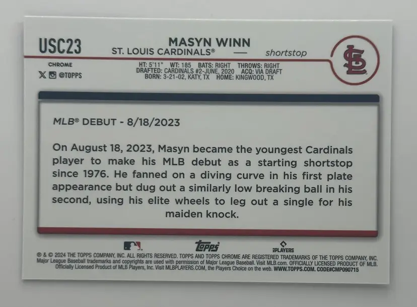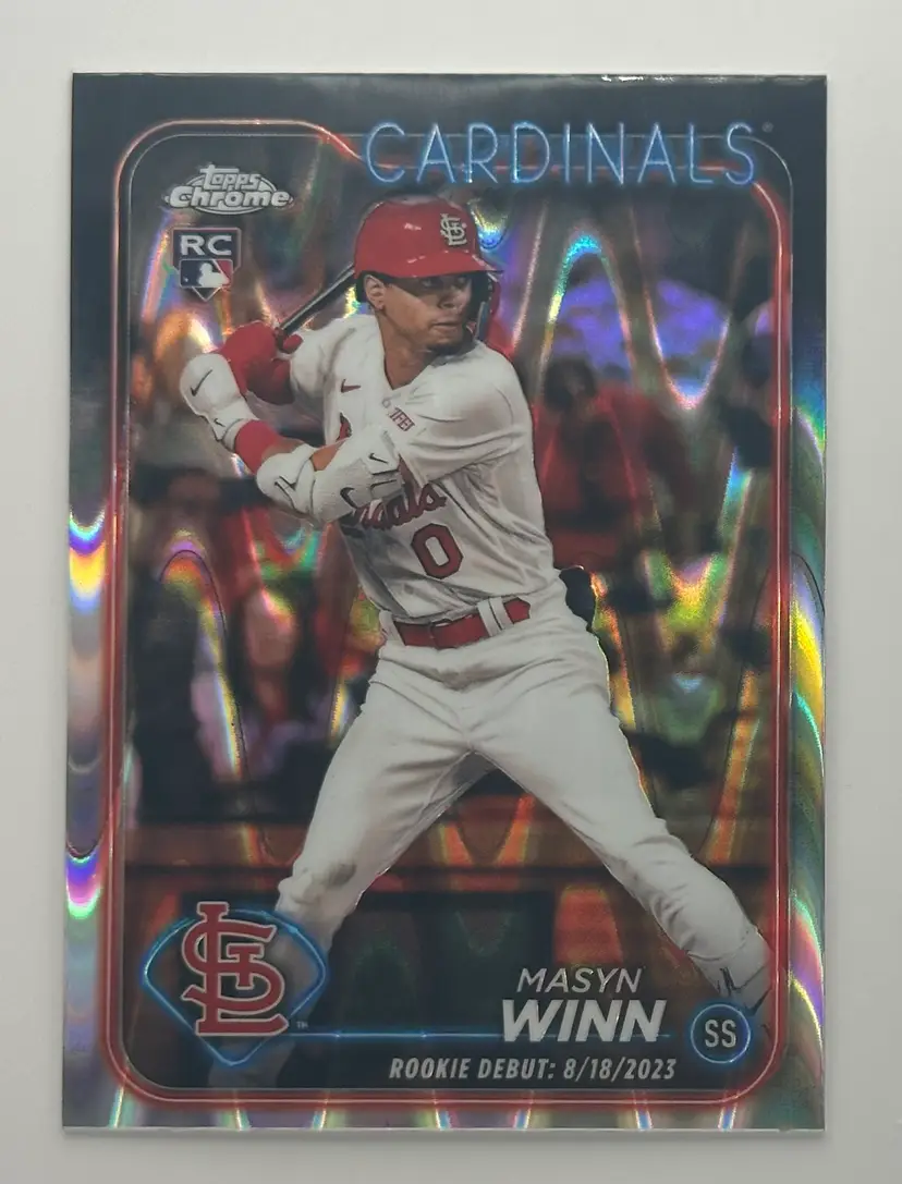 Snag this Masyn Winn rookie card from Topps Chrome, highlighting his Cardinals debut on 8/18/2023. A must-have for any St. Louis fan!